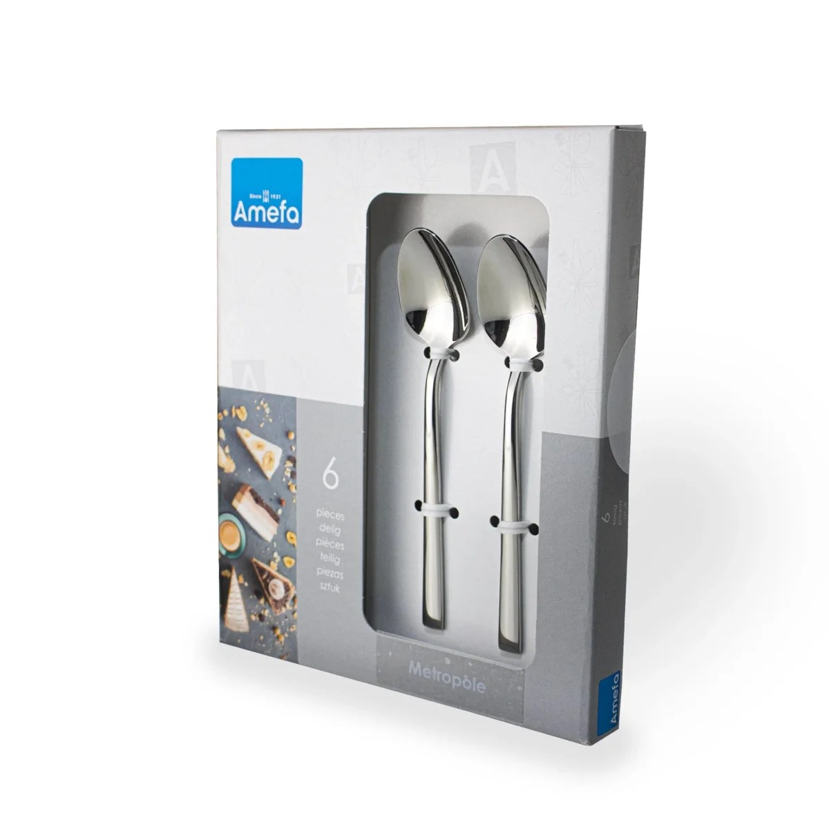 Deze Metropole theelepel set van het merk Amefa is een prachtige tijdloze theelepel set. De set heeft een slank en elegant ontwerp, met een schuin aflopend heft aan de onderzijde. Dit design is geïnspireerd door de moderne stadsarchitectuur en heeft een luxe en eigentijdse uitstraling die gemaakt is van hoogwaardig 18-10 roestvrij edelstaal. Het bestek heeft een hoogglans afwerking en is geschikt voor reiniging in de vaatwasser.