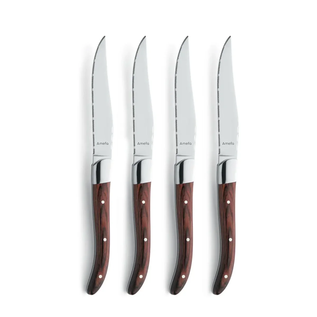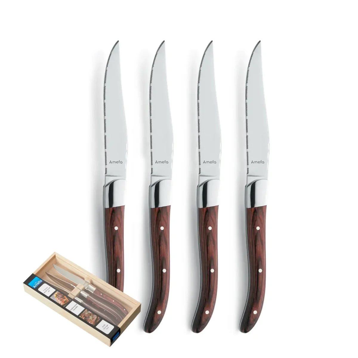 - Duurzaamheid: Gemaakt door Amefa, een merk met een lange geschiedenis van vakmanschap, zijn deze steakmessen gebouwd om lang mee te gaan. Ze zijn bestand tegen dagelijks gebruik en behouden hun scherpte en uitstraling, zelfs na talloze diners.
