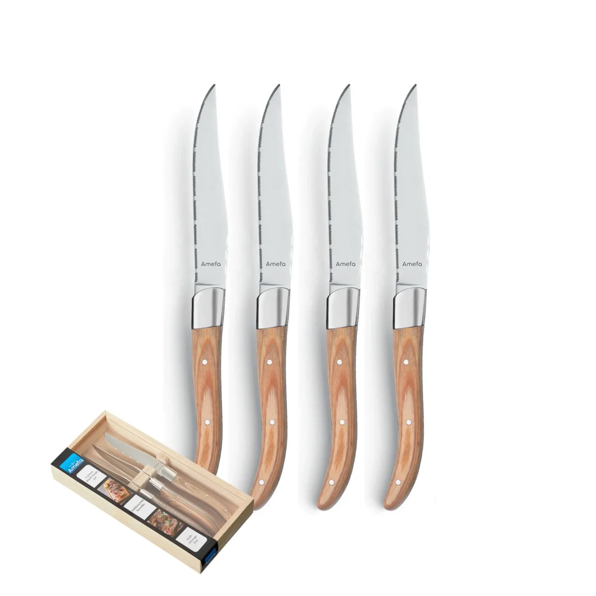 Ontdek de ultieme dinerervaring met de Amefa Royal Steak 4 Steakmessen in een prachtige Natural Wood afwerking. Deze steakmessen zijn niet zomaar messen; ze zijn ontworpen om je culinaire avonturen naar een hoger niveau te tillen en je steakdiners onvergetelijk te maken.