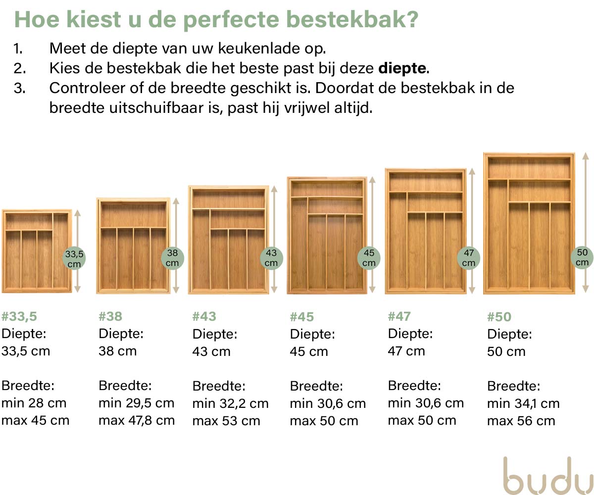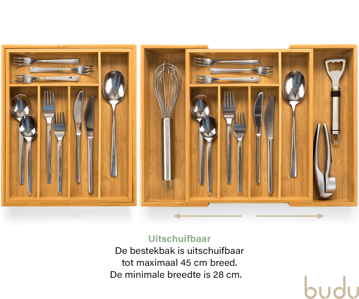 Budu heeft altijd de perfecte bestekbak voor u. Al onze bestekbakken zijn namelijk in de breedte uitschuifbaar. U kiest dus simpelweg de bestekbak die past bij de diepte van uw lade. Vervolgens schuift u de bestekbak in de breedte uit, waardoor deze perfect in de lade past.