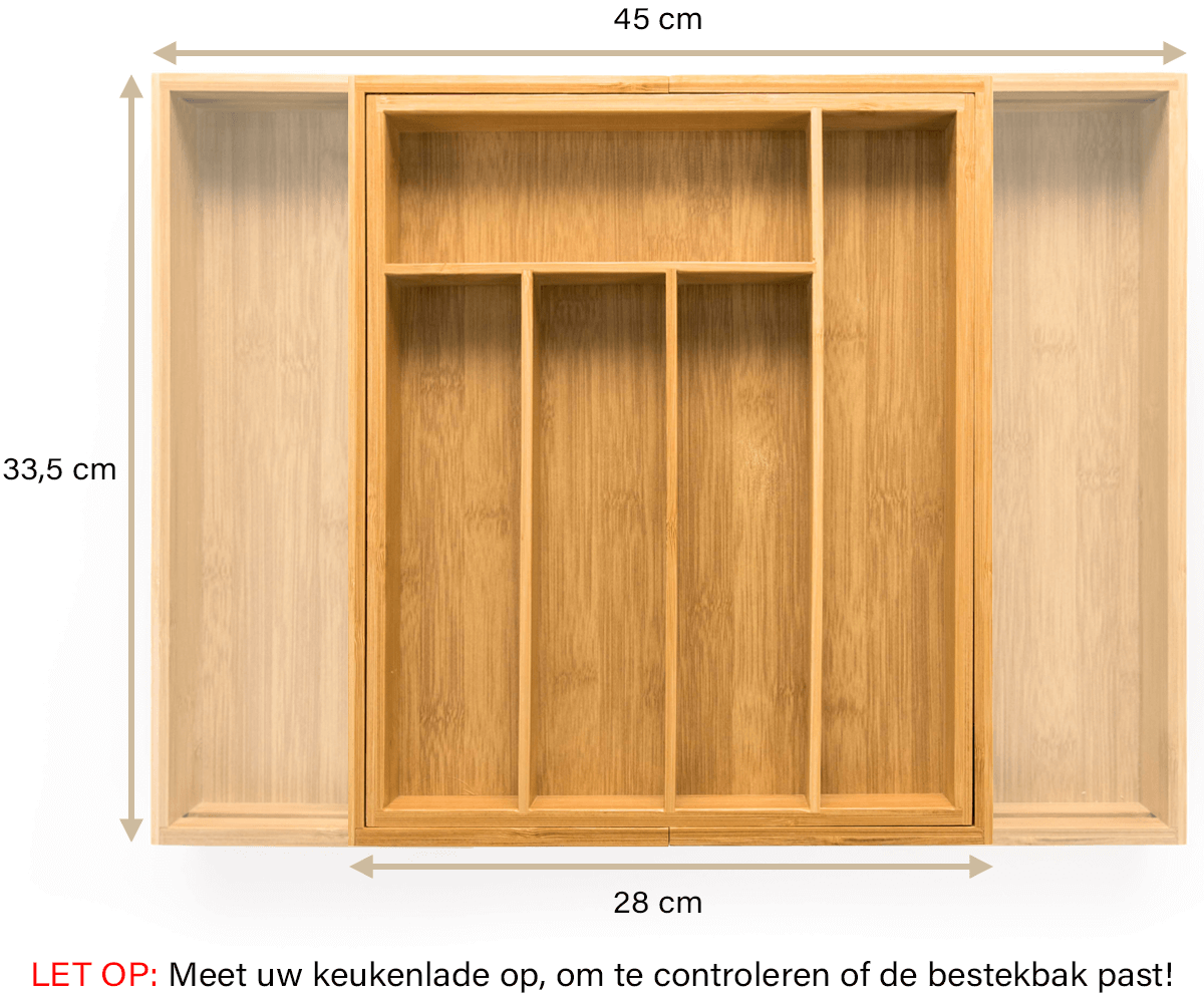 - Controleer of de breedte geschikt is. Doordat de bestekbak in de breedte uitschuifbaar is, past hij vrijwel altijd. Is uw lade te breed voor één bestekbak, dan kunt u er twee naast elkaar plaatsen.