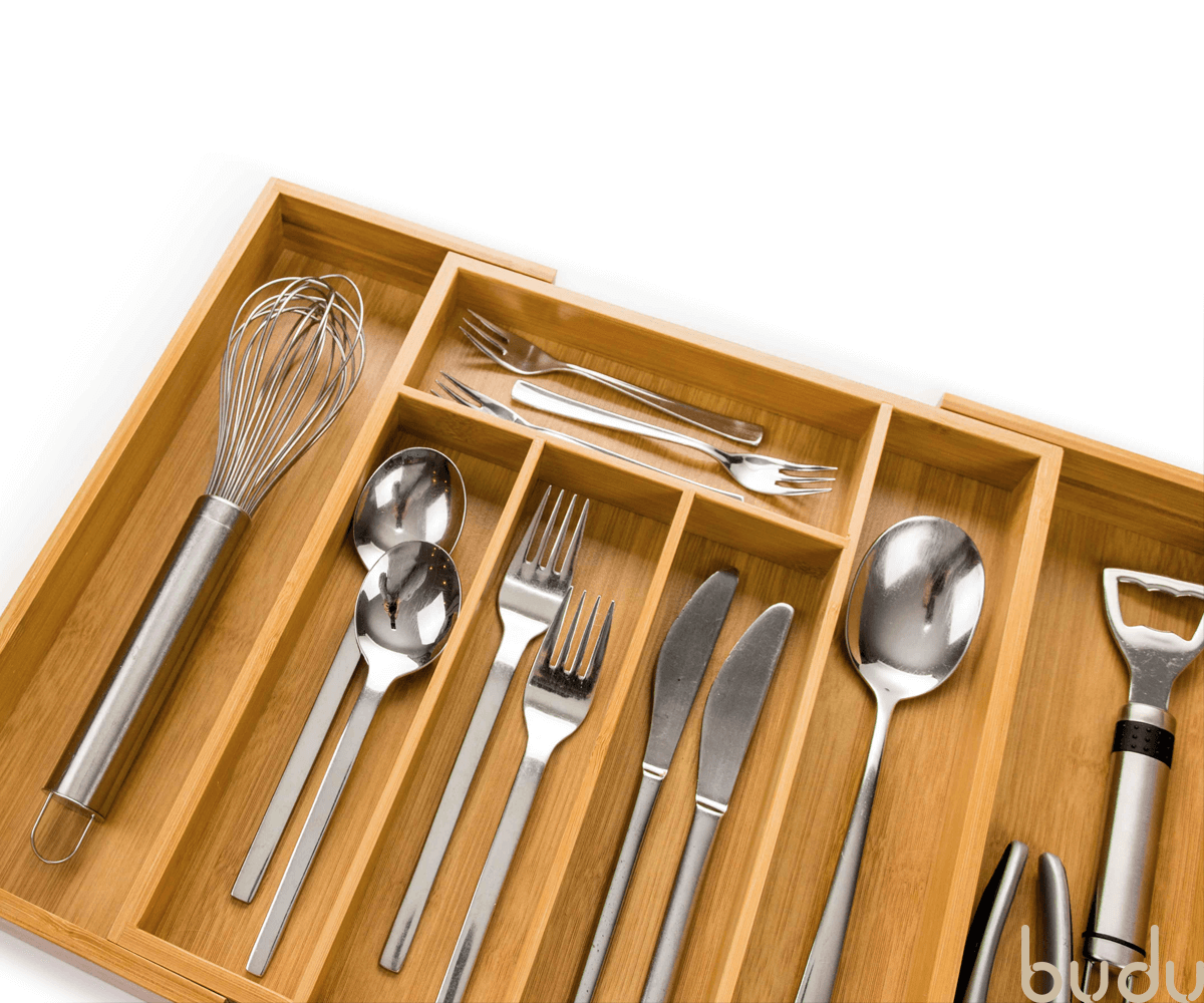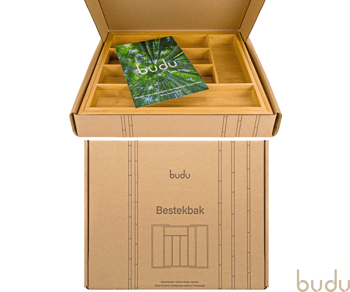 De Budu Bestekbak geeft uw besteklade een opgeruimde en luxe uitstraling. De bestekbak is gemaakt van duurzaam bamboe. Bamboe is een zeer sterk en slijtvast materiaal. De bestekbak past in vrijwel elke lade, omdat hij in de breedte uitschuifbaar is. De bestekbak beschikt over maximaal 7 compartimenten, hierdoor kunt u al uw keukengerei netjes opbergen. De bestekbak is ook te gebruiken als organizer voor andere producten, zoals kantoorartikelen, gereedschap of make-up.