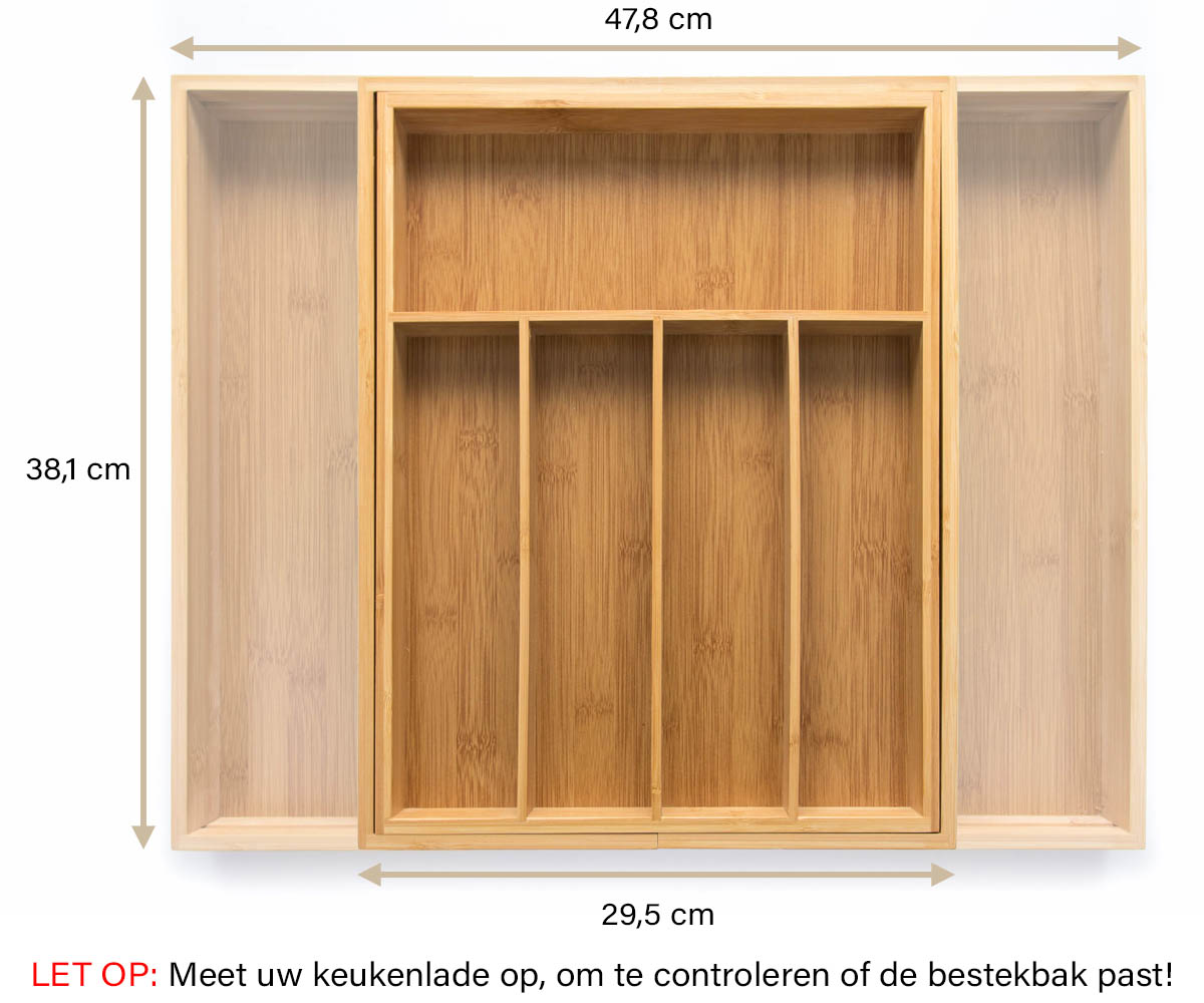 - Controleer of de breedte geschikt is. Doordat de bestekbak in de breedte uitschuifbaar is, past hij vrijwel altijd. Is uw lade te breed voor één bestekbak, dan kunt u er twee naast elkaar plaatsen.