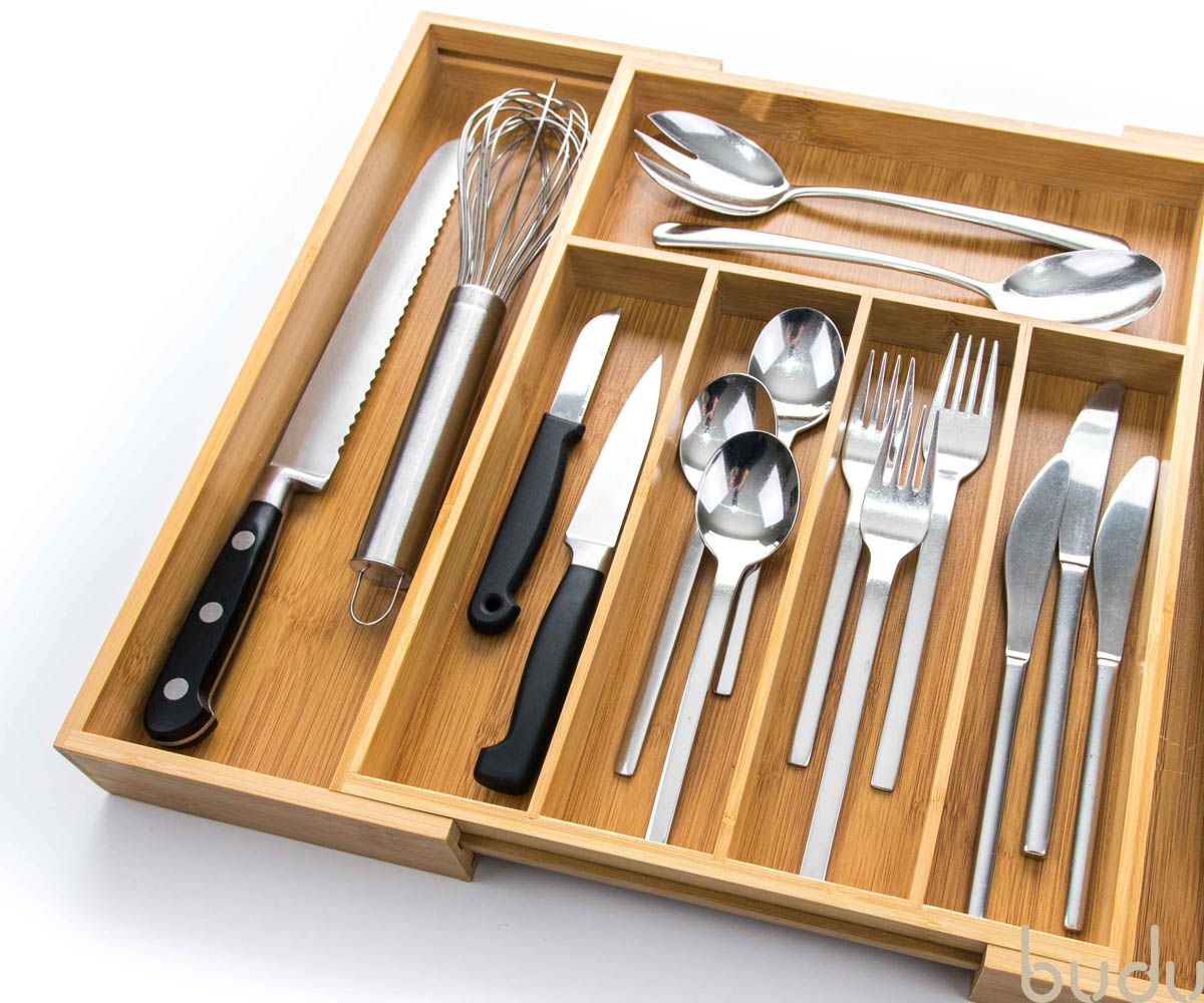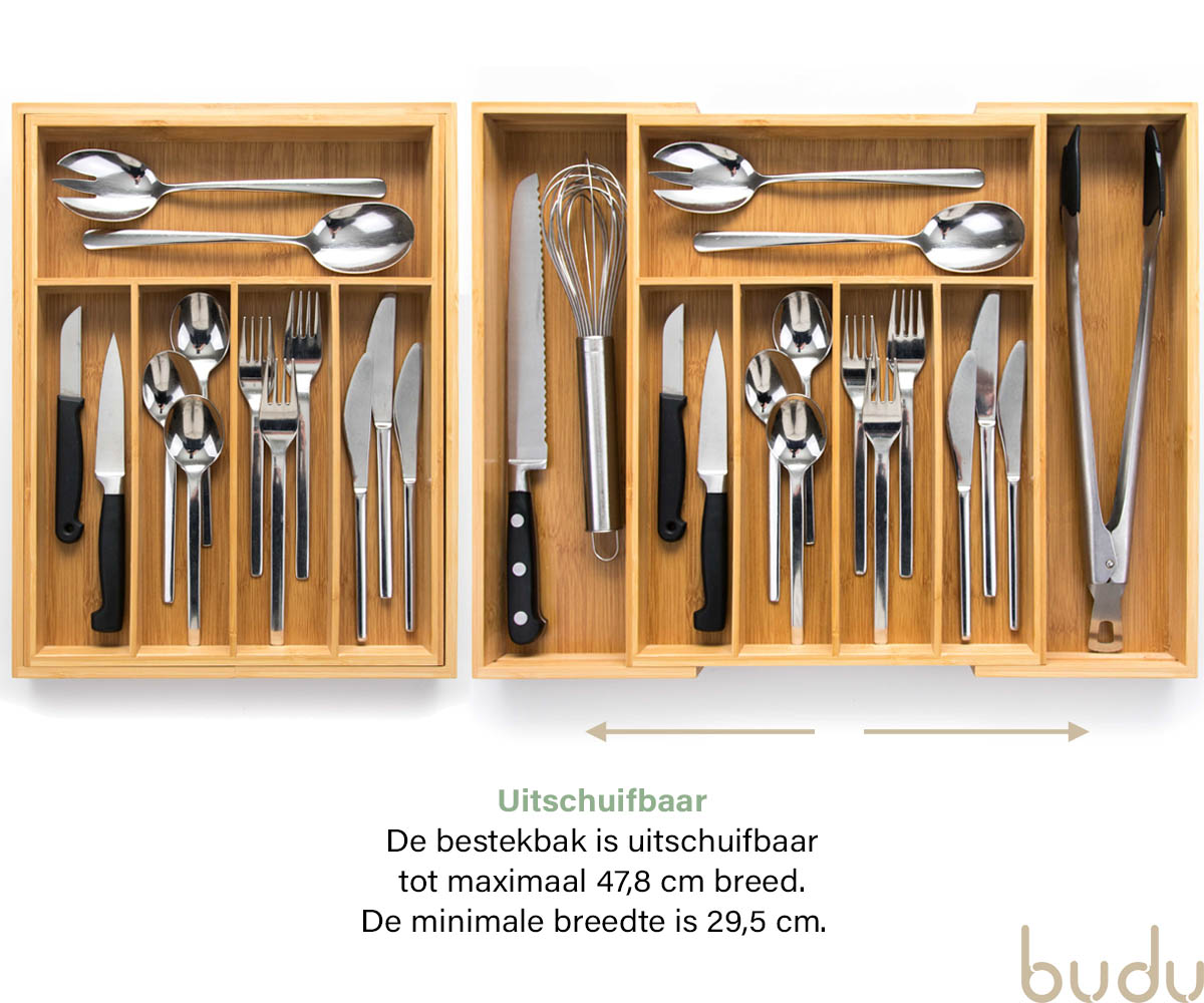 De Budu Bestekbak is onmisbaar in elke keuken. De bestekbak is gemaakt van duurzaam bamboe. Bamboe is een zeer sterk en slijtvast materiaal. Daarnaast heeft het een luxe uitstraling. De Budu Bestekbak is uitschuifbaar. Hierdoor past de bestekbak in vrijwel elke keukenlade. De bestekbak beschikt over 7 maximaal compartimenten, hierdoor kunt u al uw keukengerei netjes gesorteerd opbergen. De bestekbak is ook te gebruiken als organizer voor andere producten, zoals kantoorartikelen, gereedschap of make-up.