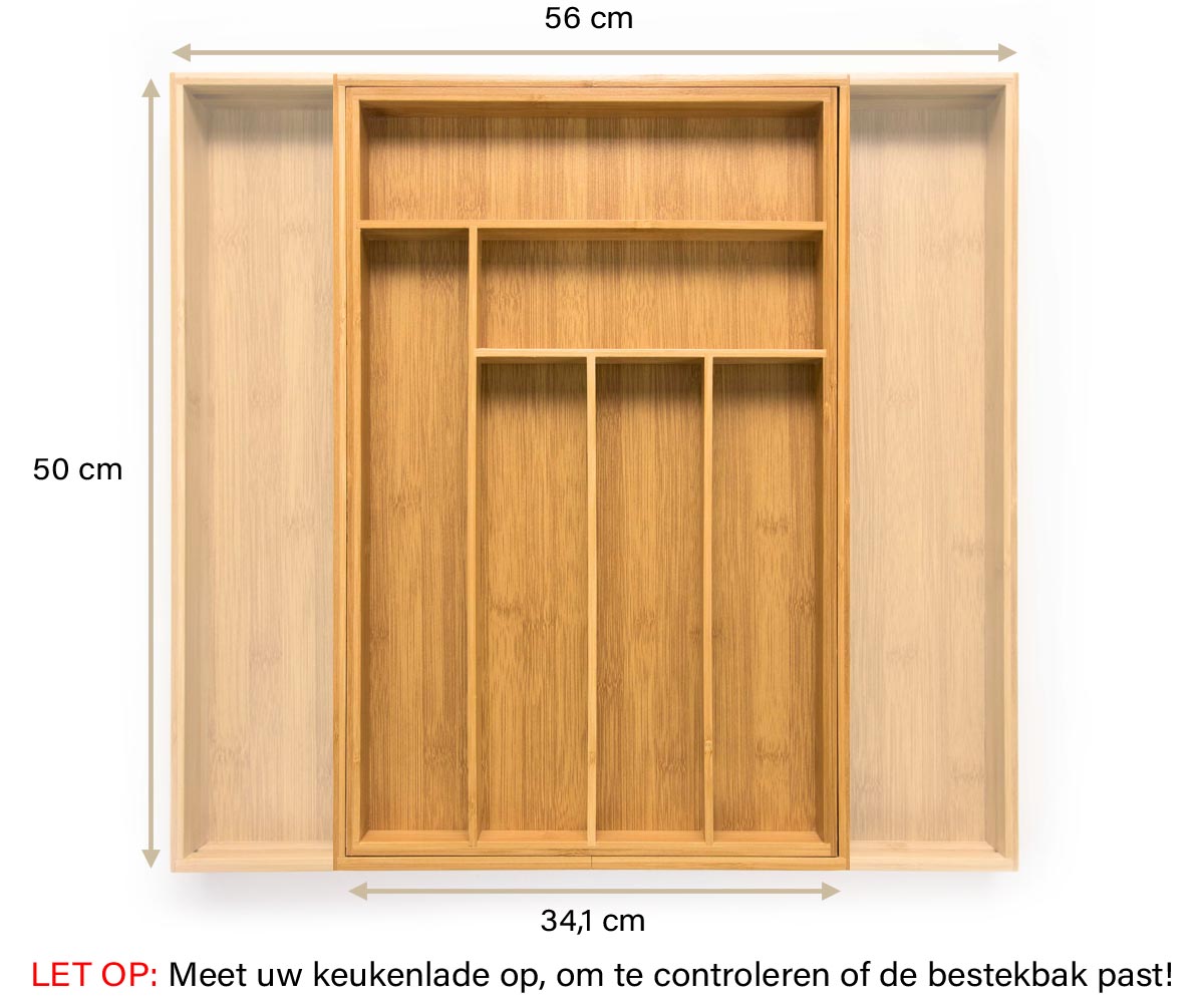 - Controleer of de breedte geschikt is. Doordat de bestekbak in de breedte uitschuifbaar is, past hij vrijwel altijd. Is uw lade te breed voor één bestekbak, dan kunt u er twee naast elkaar plaatsen.