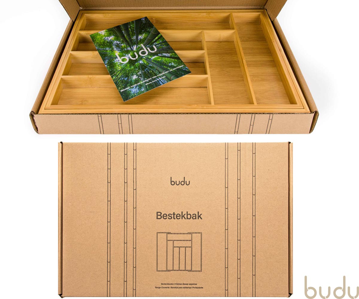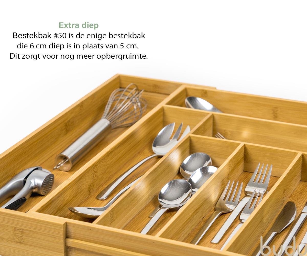 De Budu Bestekbak geeft uw besteklade een opgeruimde en luxe uitstraling. De bestekbak is gemaakt van duurzaam bamboe. Bamboe is een zeer sterk en slijtvast materiaal. De bestekbak past in vrijwel elke lade, omdat hij in de breedte uitschuifbaar is. De bestekbak beschikt over maximaal 8 compartimenten, hierdoor kunt u al uw keukengerei netjes opbergen. De bestekbak is ook te gebruiken als organizer voor andere producten, zoals kantoorartikelen, gereedschap of make-up.