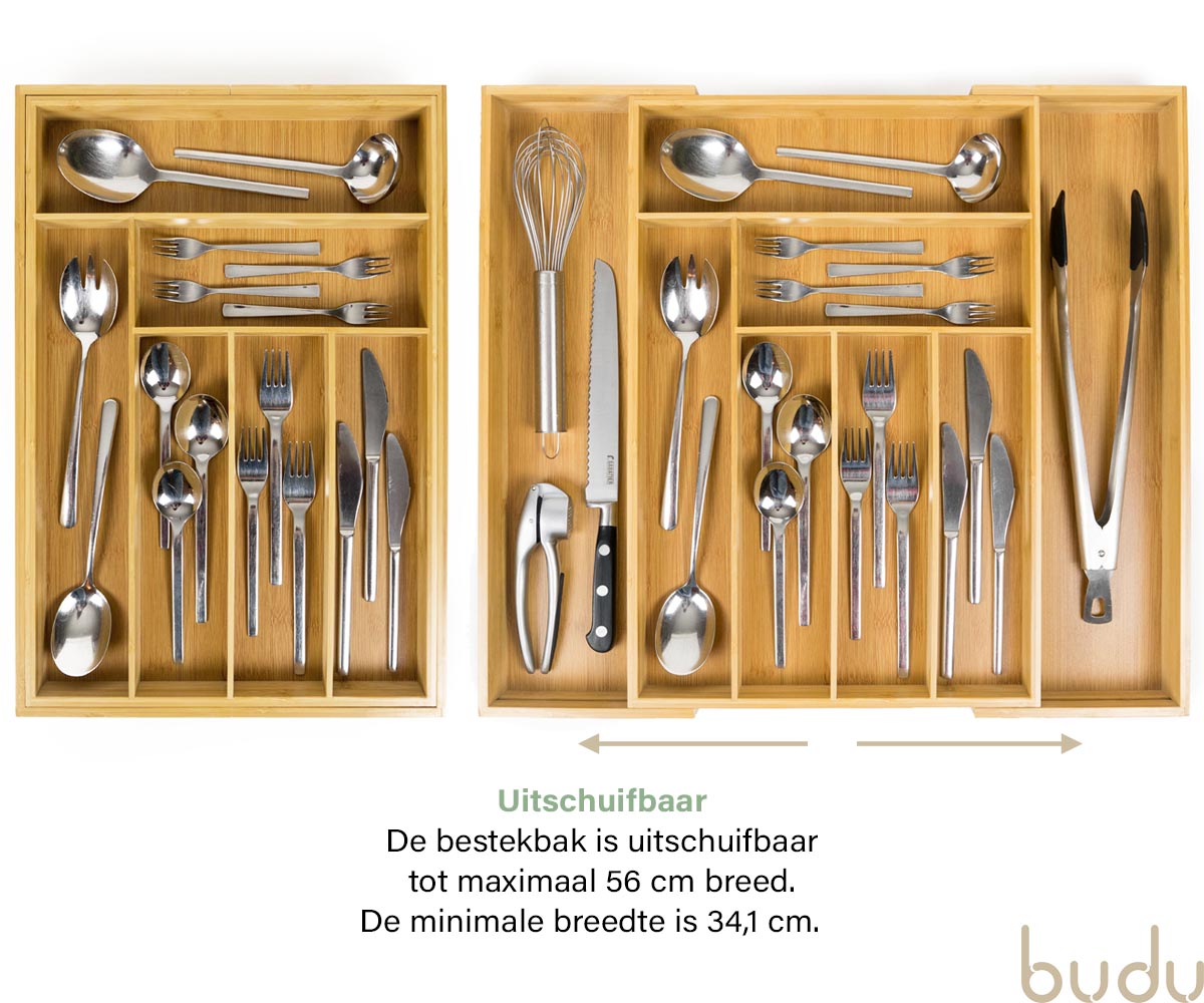 Budu heeft altijd de perfecte bestekbak voor u. Al onze bestekbakken zijn namelijk in de breedte uitschuifbaar. U kiest dus simpelweg de bestekbak die past bij de diepte van uw lade. Vervolgens schuift u de bestekbak in de breedte uit, waardoor deze perfect in de lade past.