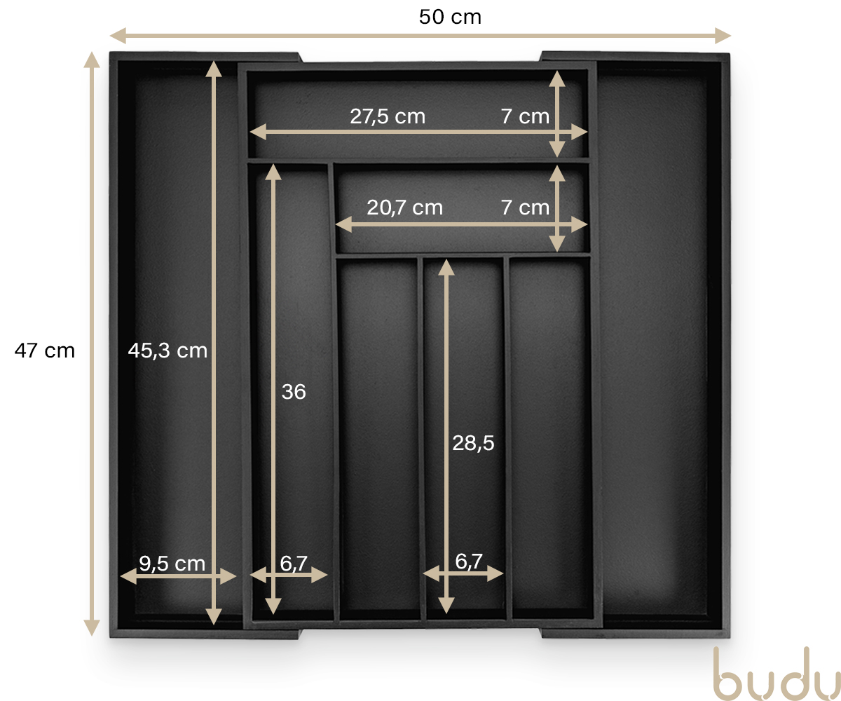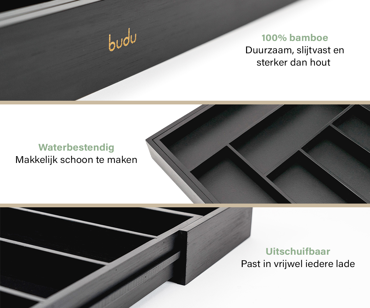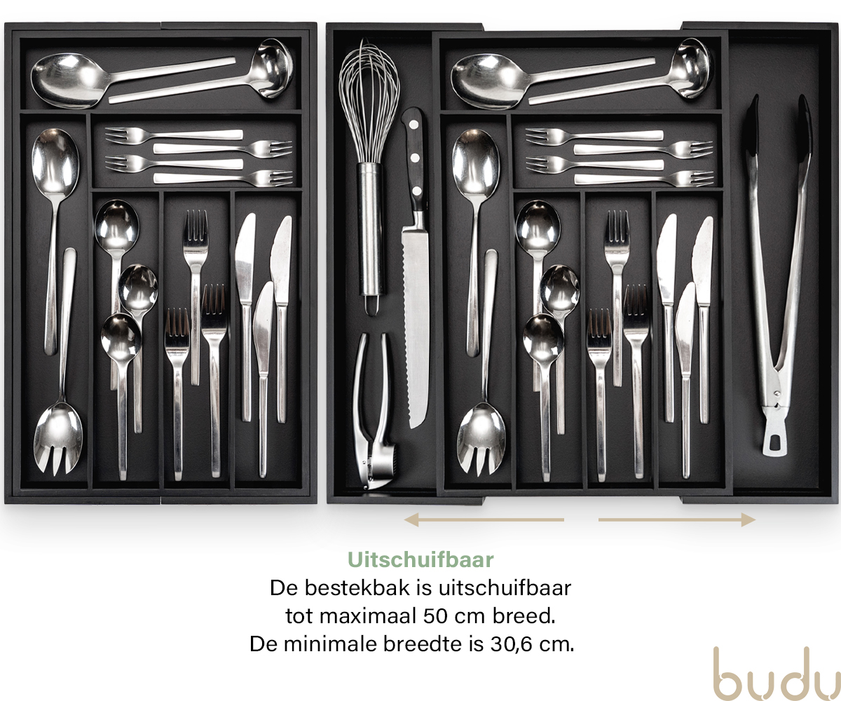 Budu heeft altijd de perfecte bestekbak voor u. Al onze bestekbakken zijn namelijk in de breedte uitschuifbaar. U kiest dus simpelweg de bestekbak die past bij de diepte van uw lade. Vervolgens schuift u de bestekbak in de breedte uit, waardoor deze perfect in de lade past.