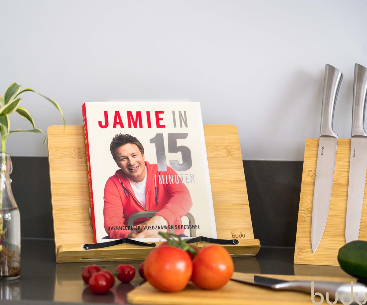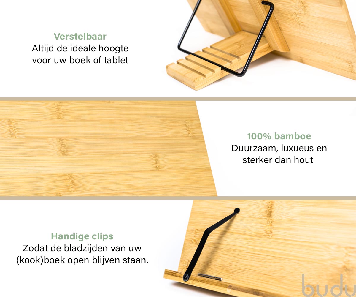 De verstelbare budu boekenstandaard maakt naar recept koken nog makkelijker! De inklapbare boekenhouder neemt weinig ruimte in beslag en dankzij de bladzijdehouders blijft uw kookboek ten allen tijde geopend op de gewenste pagina. Tevens is de book holder ook te gebruiken als tablethouder, op het kantoor of tijdens de studie. Dankzij de kleur van het natuurlijke bamboe past de leesstandaard in iedere keuken! De verstelbare boekenstandaard is gemaakt van 100% bamboe.