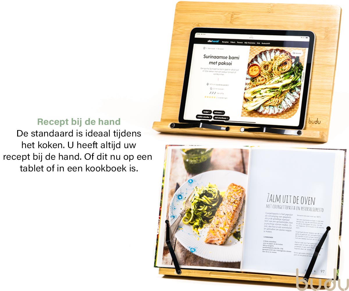 - Multifunctioneel: kookboekenstandaard, tabletstandaard etc.