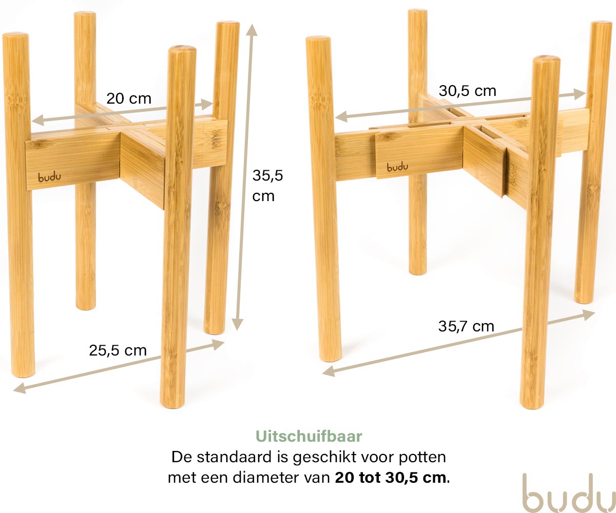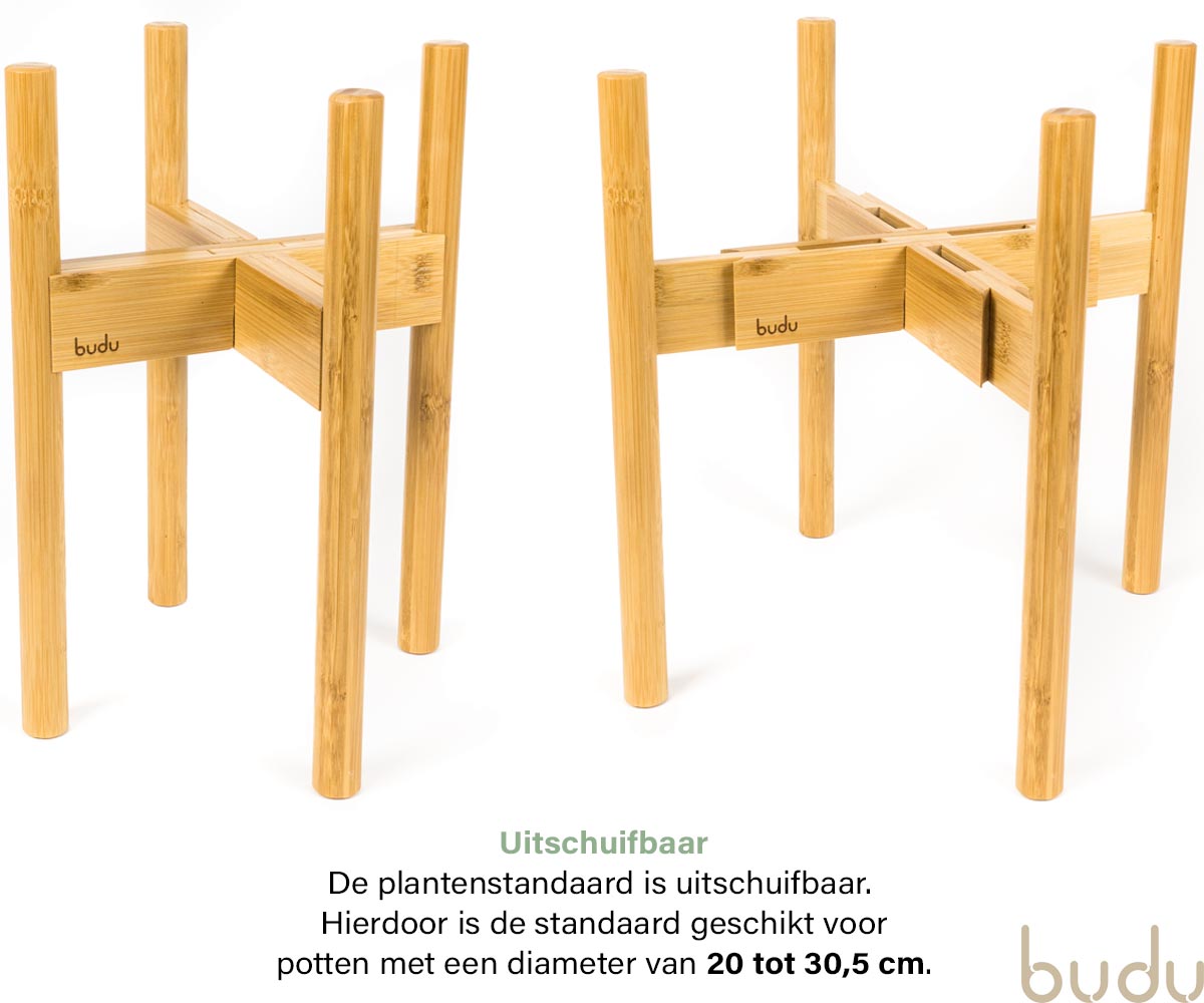 De budu planten standaard maakt van jouw huis een thuis. Dankzij de kleur van het natuurlijke bamboe past de plantenstandaard in ieder huis, en past deze bij verschillende plantensoorten en potten. De plantenhouder is uitschuifbaar voor potten van 20cm tot 30cm. De plantentafel is gemaakt van 100% bamboe. Het plantenrek is eenvoudig te monteren, met behulp van één schroef en een meegeleverde inbussleutel.