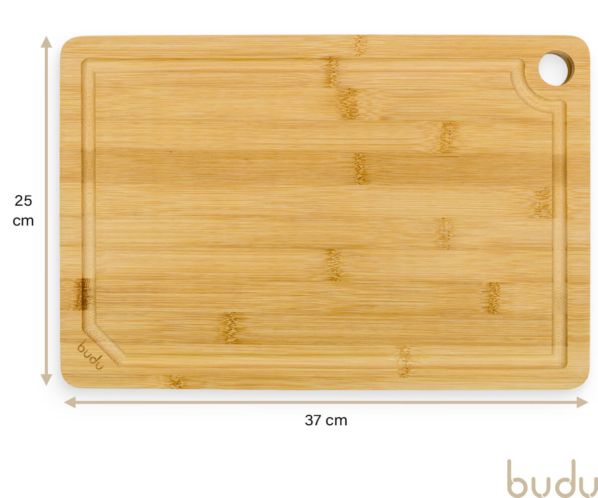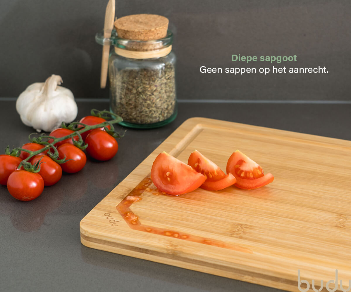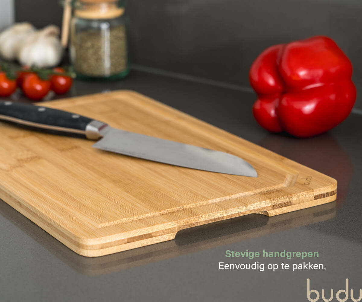 De Budu Snijplank met sapgeul combineert functionaliteit, duurzaamheid en luxe. Deze snijplank, vervaardigd uit 100% FSC®-gecertificeerd bamboe, is niet alleen sterk en slijtvast, maar biedt ook een elegante uitstraling die in elke keuken past. De snijplank is voorzien van een diepe sapgoot, handige handgrepen en een oog om de plank om te kunnen hangen.