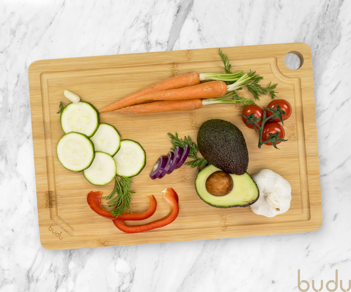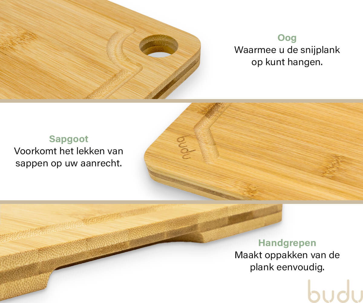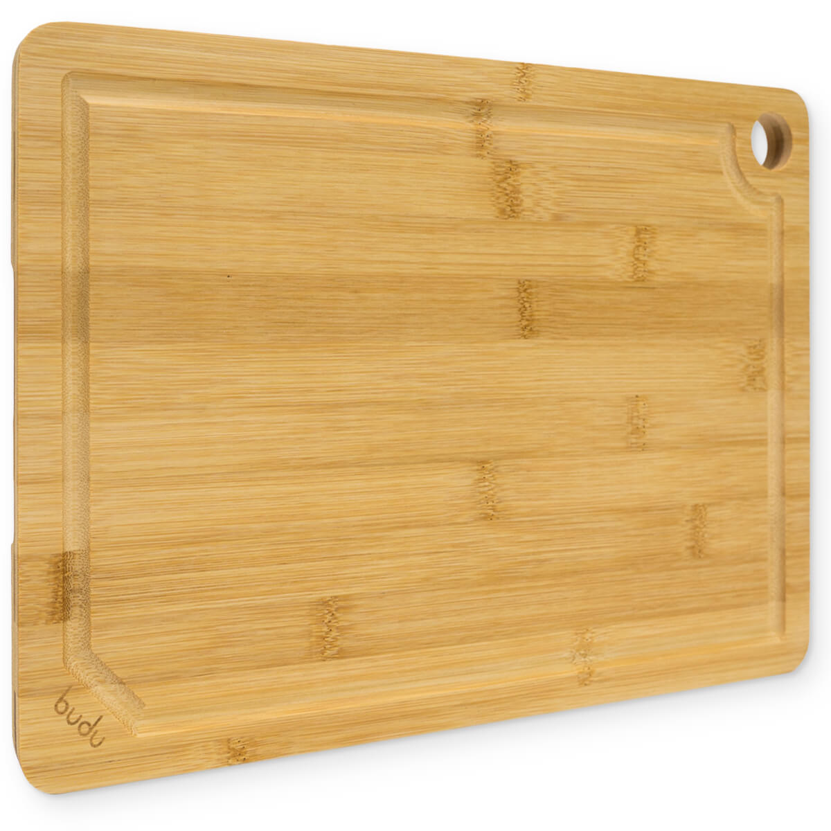 De Budu Snijplank met sapgeul combineert functionaliteit, duurzaamheid en luxe. Deze snijplank, vervaardigd uit 100% FSC®-gecertificeerd bamboe, is niet alleen sterk en slijtvast, maar biedt ook een elegante uitstraling die in elke keuken past. De snijplank is voorzien van een diepe sapgoot, handige handgrepen en een oog om de plank om te kunnen hangen.