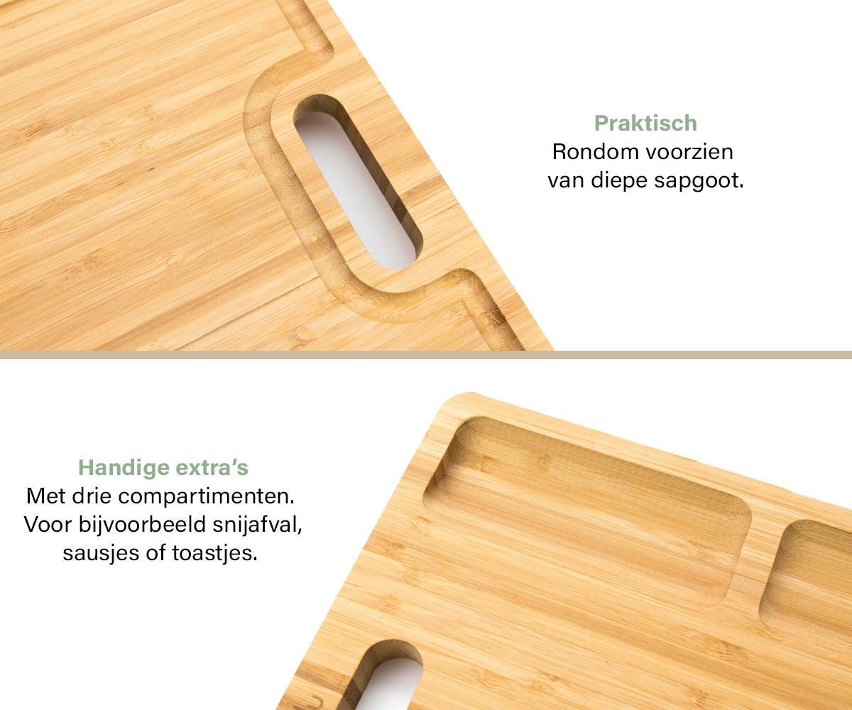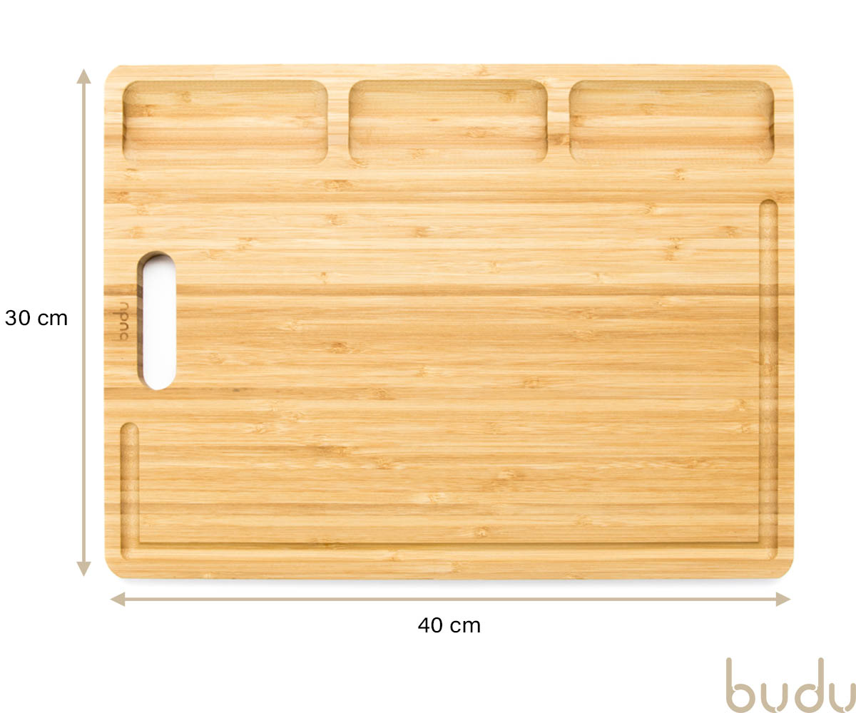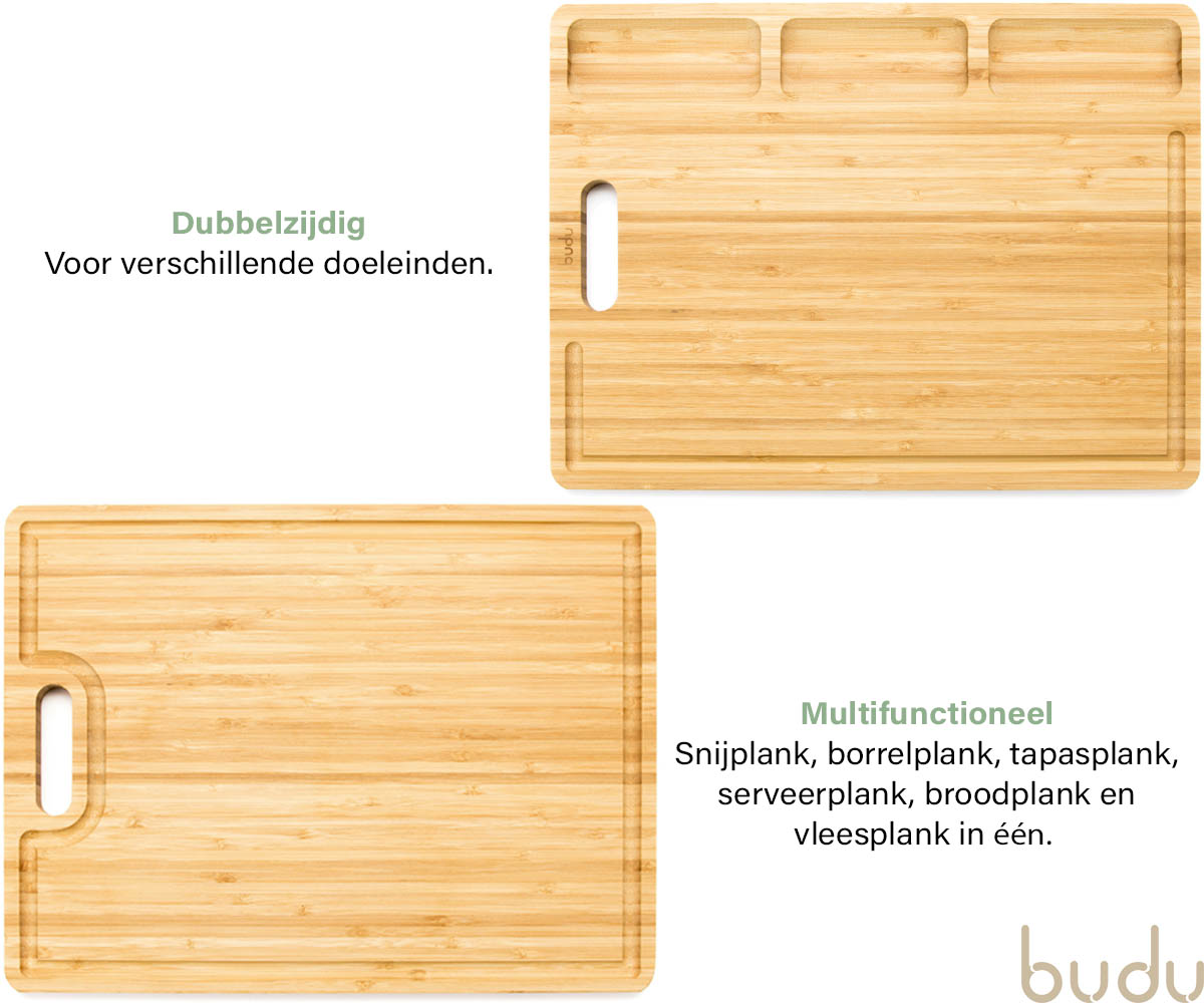 De Budu Borrelplank is onmisbaar bij elke borrel. De grote borrelplank is gemaakt van 100% duurzaam bamboe. Bamboe is een zeer sterk en slijtvast materiaal. De borrelplank is multifunctioneel. Zo is de plank te gebruiken als borrelplank, serveerplank, tapasplank of als snijplank. De borrelplank is voorzien van 3 handige vakjes. Deze vakjes zijn geschikt voor bijvoorbeeld toastjes, olijven of party prikkers. De achterzijde is rondom voorzien van een sapgoot. Hierdoor is de plank ook te gebruiken als snijplank of vleesplank.