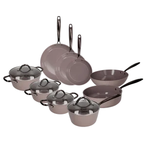 Was de pannen bij voorkeur met de hand met een mild schoonmaakmiddel en een zachte spons. Gebruik siliconen, houten of nylon keukengerei om de antiaanbaklaag te beschermen en vermijd scherpe voorwerpen of oververhitting.
