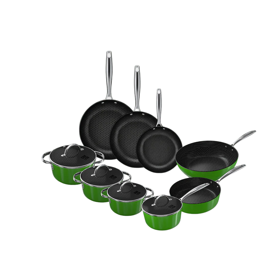 Ontdek de Go Green Honey 9-delige pannenset, jouw stijlvolle, complete en duurzame keukenbasis. Deze elegante groene set combineert kracht, controle en karakter. Of je nu een omelet bakt, een curry wokt of een diner voor zes bereidt: met deze set heb je alles wat je nodig hebt.