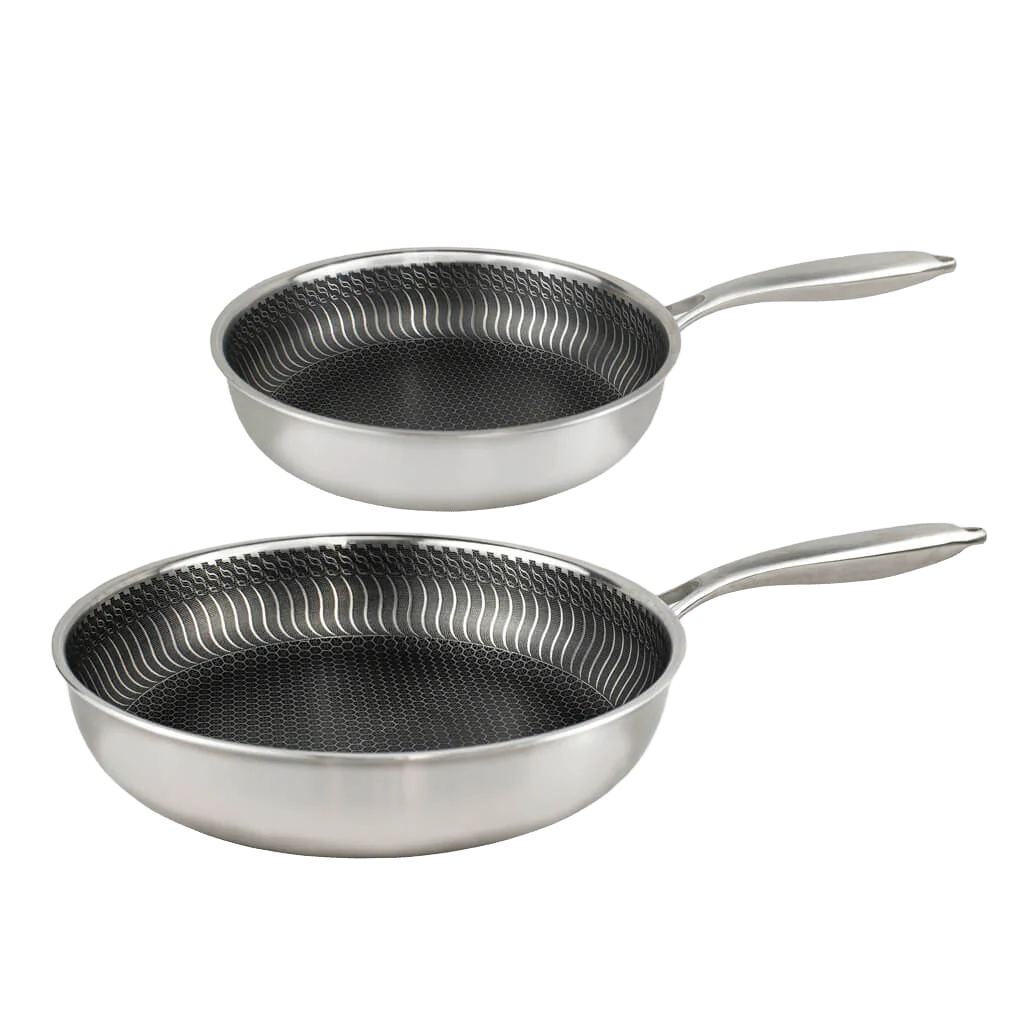 De pannen zijn vervaardigd uit hoogwaardig roestvrij staal (RVS) en voorzien van een innovatieve honinggraat 3-ply antiaanbaklaag. Deze zorgt voor een optimale warmteverdeling en een duurzaam oppervlak dat bestand is tegen intensief gebruik. Ideaal voor zowel de hobbykok als de professionele chef!
