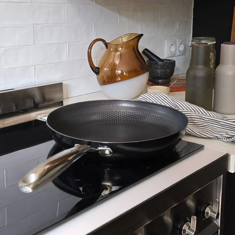Een tip van de chef: Gebruik de 24 cm pan voor perfect gebakken eieren of groenten, en de 28 cm pan voor een sappige steak met die ideale krokante korst. De honinggraatstructuur houdt alles los, zelfs zonder olie!