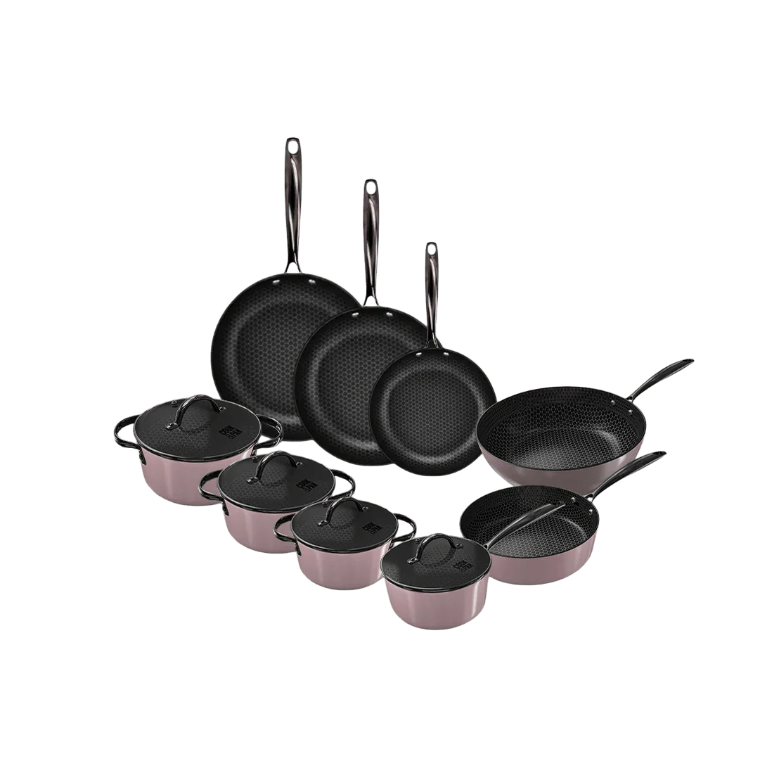 De PFAS-vrije Honinggraat 3-Ply keramische antiaanbaklaag zorgt voor gezond koken zonder dat iets aanbakt, terwijl de dikke RVS-bodem zorgt voor snelle, gelijkmatige warmteverdeling. Slim stapelbaar, ovenbestendig tot 280 °C en vaatwasserbestendig, deze set brengt stijl, kracht en gemak samen in één lijn. Koken was nog nooit zo elegant én eenvoudig.