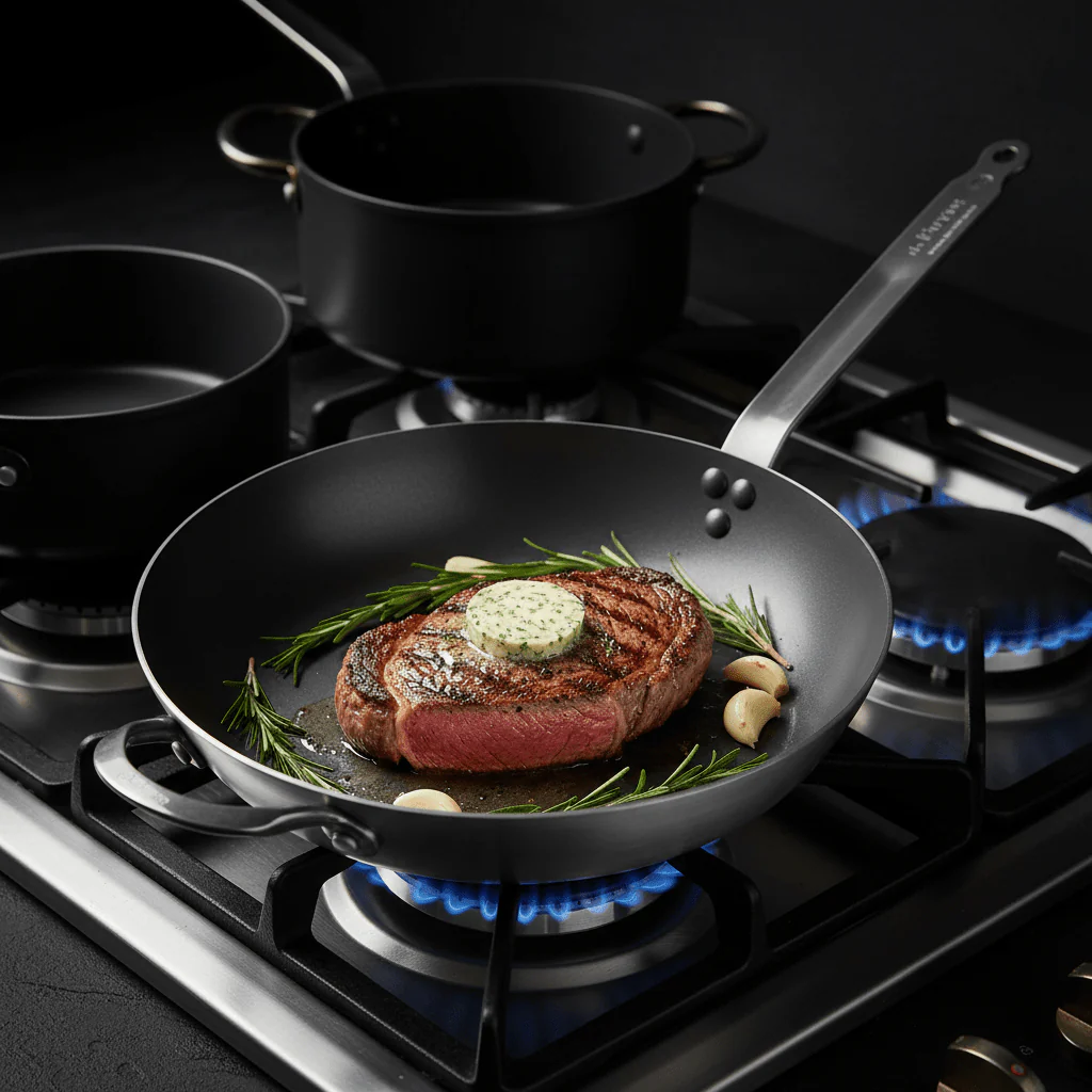 - Lyonnaise-profiel: afgeronde rand waardoor voedsel gemakkelijk uit de pan glijdt, perfect voor karamellisatie dankzij de Maillardreactie.