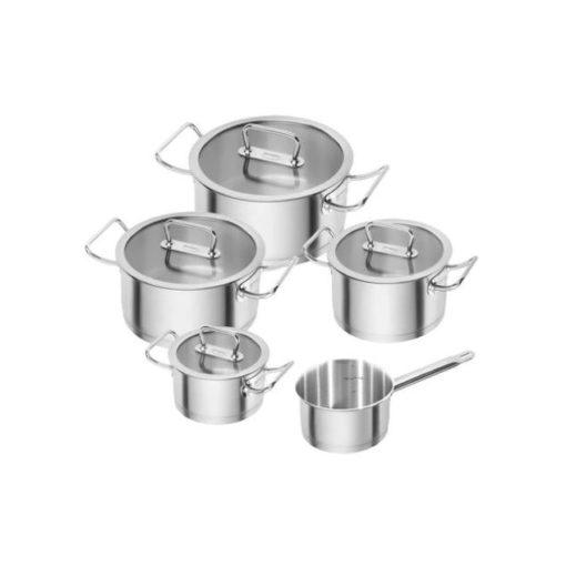 De pannen zijn uitgevoerd in mat gepolijst RVS met comfortabele grote grepen en een glazen