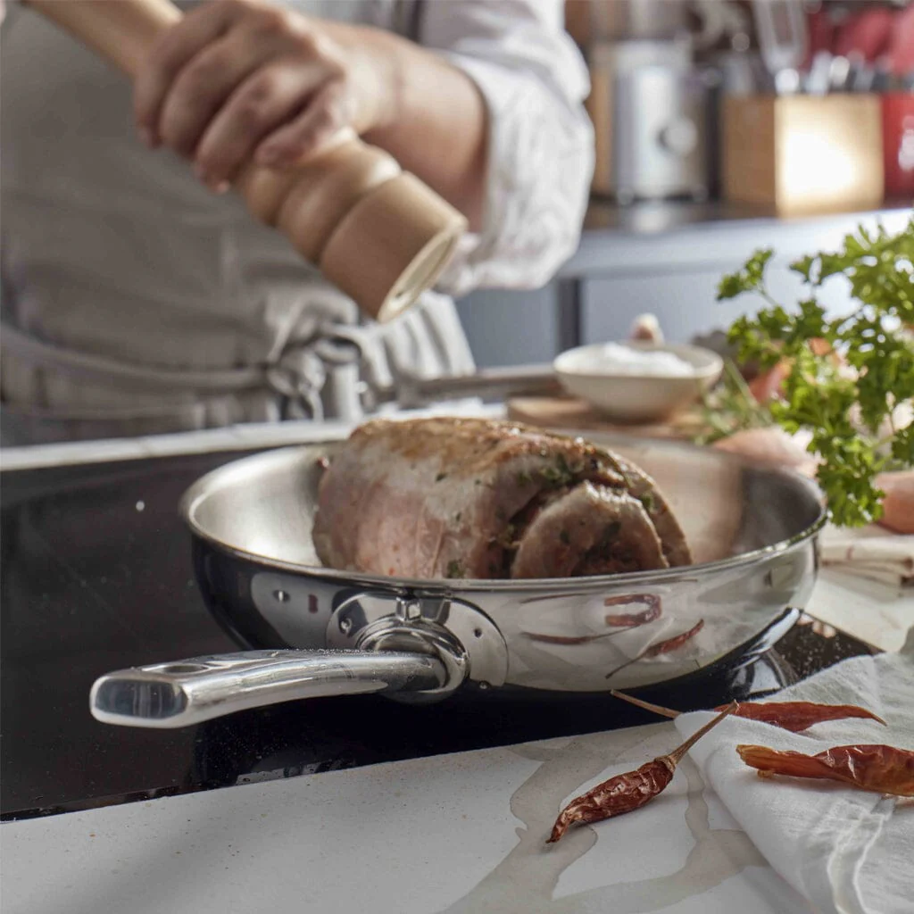 Deze pan heeft een 5-laags bodem. 5-laags pannen tillen het kookproces naar een hoger niveau met vijf lagen van aluminium en roestvrij staal. Deze extra lagen zorgen voor nog betere warmteverspreiding en -behoud, waardoor je meer controle hebt over de temperatuur. Ideaal voor delicate kooktechnieken, waarbij precisie het verschil maakt. Het gewicht van de pan geeft je dat extra stukje stabiliteit tijdens het koken.