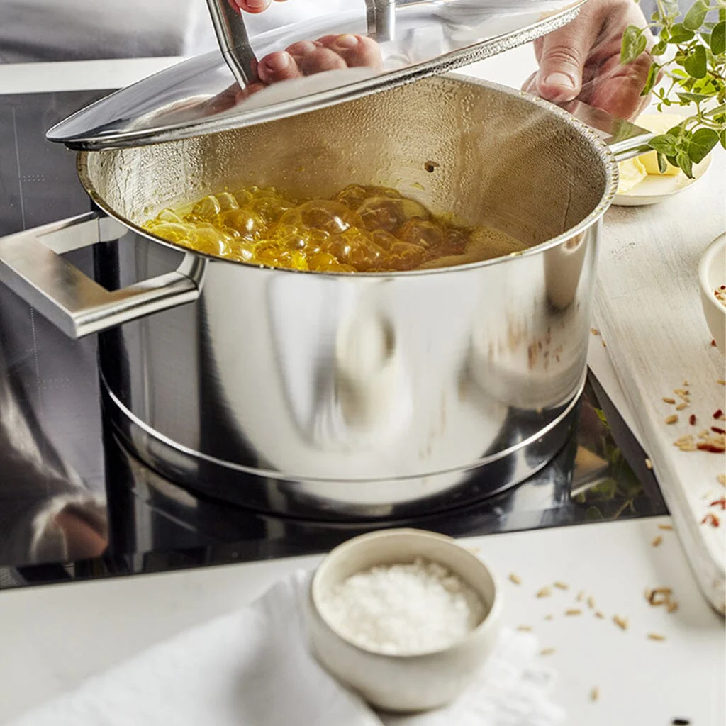 Met de 7-laags InductoSeal® bodem en koperen kern geniet je van een perfecte warmteverdeling, zelfs bij lage temperaturen. De zijkant van de pannen zijn voorzien van een hermetisch dichtgelaste naad tussen bodem en pan, wat zorgt voor eenvoudig onderhoud en optimale hygiëne. Dankzij de exclusieve TriplInduc® technologie kook je met de John Pawson 7 op inductie efficiënter en behoud je volledige controle over de temperatuur, wat je tot wel 30% energie kan besparen.