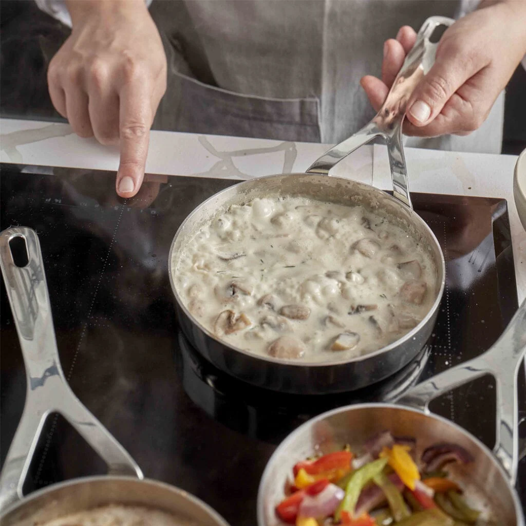 Deze pan heeft een 3-laags bodem. 3-laags pannen hebben een kern van aluminium tussen twee lagen roestvrij staal. Dit ontwerp zorgt voor uitstekende warmtegeleiding, terwijl het roestvrij staal aan de buitenkant je pan beschermt tegen corrosie en ervoor zorgt dat het materiaal niet reageert met voedsel. Het resultaat? Duurzaamheid en een gelijkmatige bereiding van je gerechten, keer op keer.