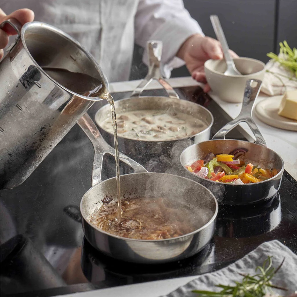 Deze pan heeft een 3-laags bodem. 3-laags pannen hebben een kern van aluminium tussen twee lagen roestvrij staal. Dit ontwerp zorgt voor uitstekende warmtegeleiding, terwijl het roestvrij staal aan de buitenkant je pan beschermt tegen corrosie en ervoor zorgt dat het materiaal niet reageert met voedsel. Het resultaat? Duurzaamheid en een gelijkmatige bereiding van je gerechten, keer op keer.
