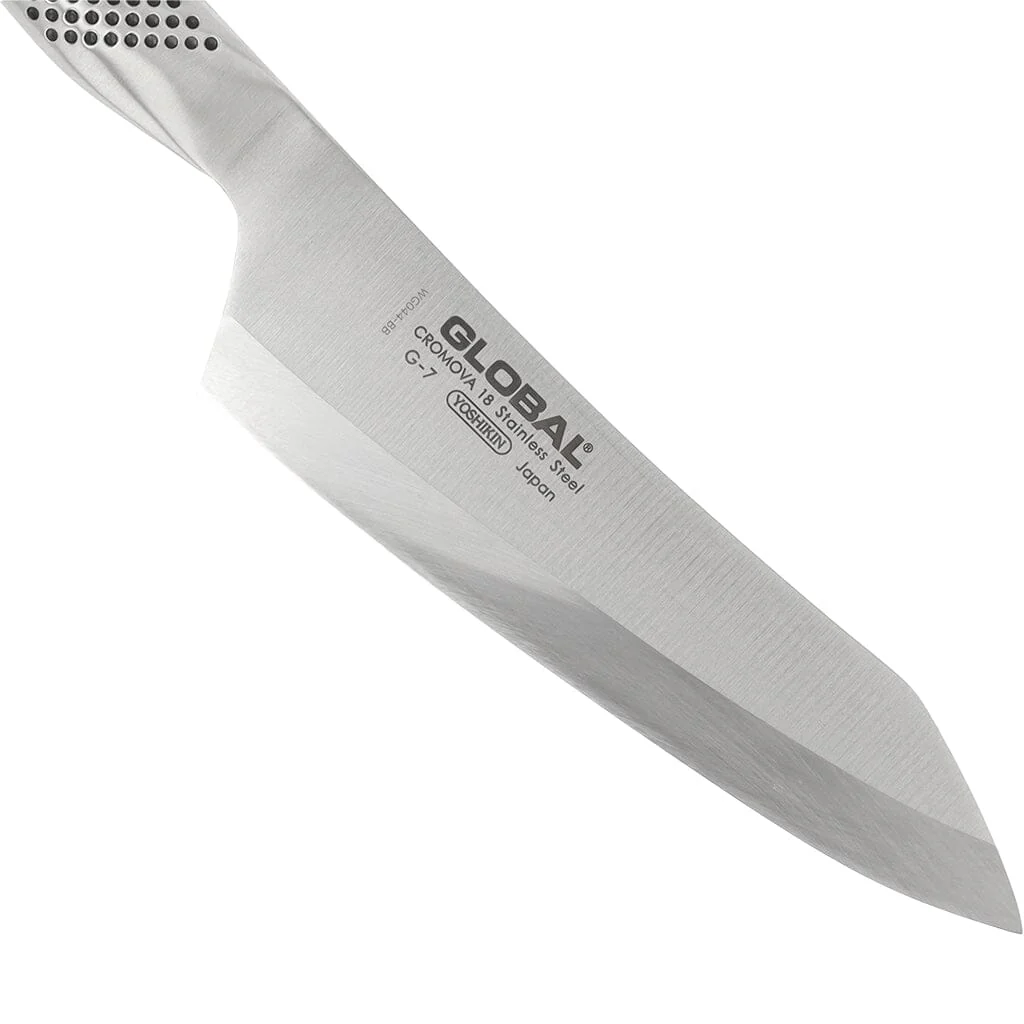 - Gepatenteerd CROMOVA 18-staal: Global-messen zijn gemaakt van Cromova 18-staal. Deze staalsoort is gepatenteerd door Global en wordt dus alleen door hun gebruikt. Door de erg fijne korrelstructuur van het staal, zijn de messen heel scherp te slijpen. Dit Deba mes is enkelzijdig geslepen in een slijphoek van 15˚, deze is dus 15˚ scherper dan een dubbelzijdige geslepen Global mes met een totale slijphoek van 30˚. Het chroom in de samenstelling van het staal zorgt ervoor dat het een goede corrosiebestendigheid heeft. Het gaat dus om roestvast staal. Cromova 18 heeft een hardheid van 58 HRC. Dat is iets lager dan de meeste Japanse keukenmessen. Het voordeel hiervan is dat je de messen zelf gemakkelijk bijslijpt.