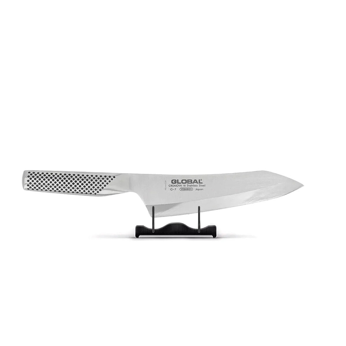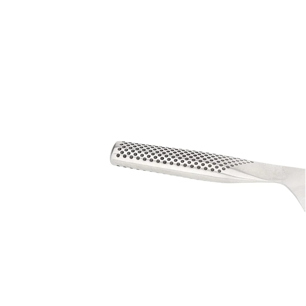 - Convex geslepen: Het lemmet van Global-messen is convex geslepen. Dit betekent dat de snede van het lemmet in een U-vorm geslepen is in plaats van een V-vorm. Het voordeel van een convex geslepen mes is dat de snede veel sterker is. Ook convex geslepen messen kun je gewoon zelf bijslijpen. Hiervoor gebruik je een slijpsteen (of een bandslijpmachine), maar je kunt er geen doortrekslijper voor gebruiken.