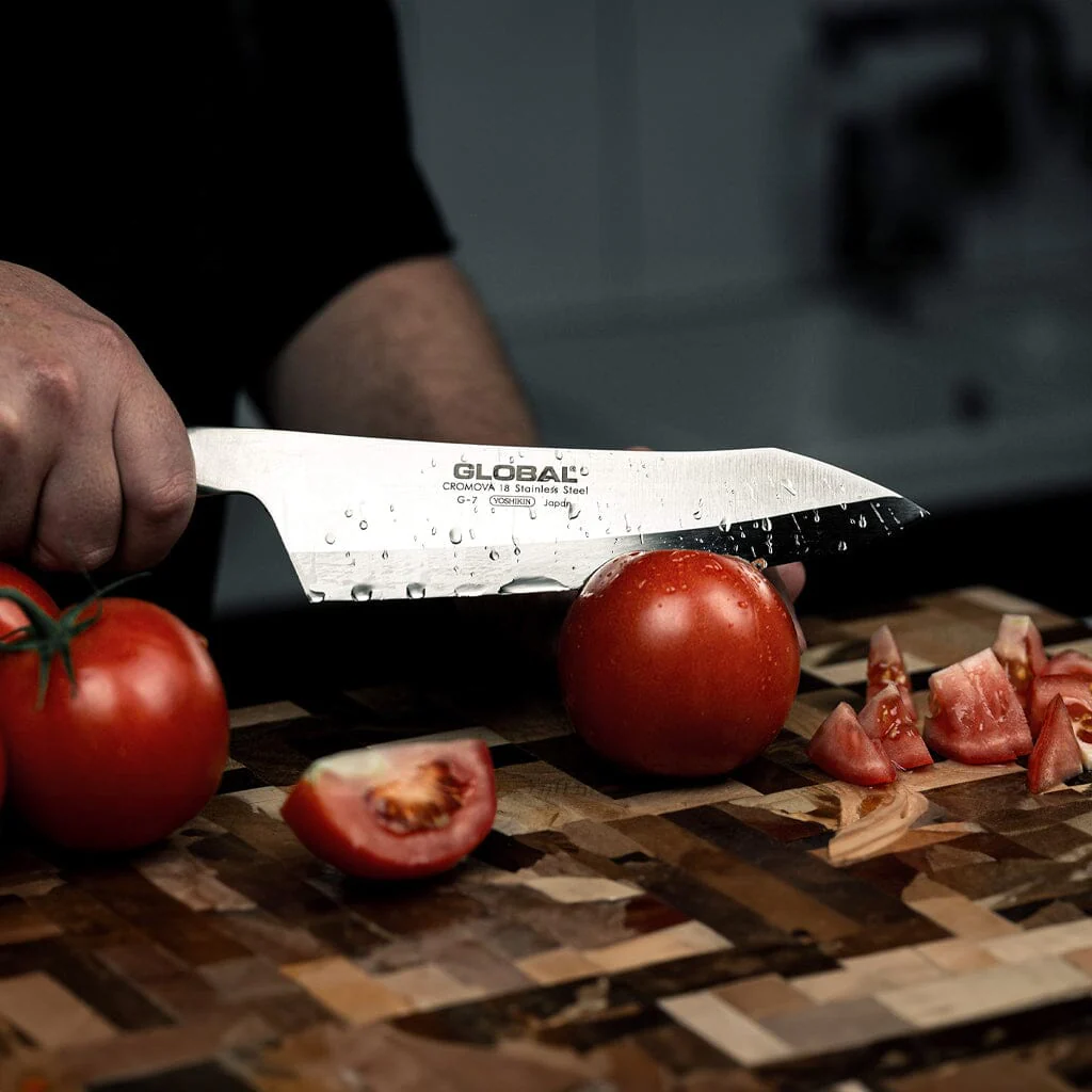 Het schoonmaken van je Global-messen is heel makkelijk. Het lemmet en de handgreep lopen naadloos in elkaar over. Bacteriën kunnen daarom nergens tussen komen te zitten. Ook is de roestvast stalen handgreep een stuk minder kwetsbaar dan hout. De handgreep van Global-messen splijt niet wanneer hij te (lang) vochtig blijft. Ondanks dat de messen gemaakt zijn van roestvast staal, raden we af om ze in de vaatwasser te doen. Wanneer het lemmet in contact komt met andere harde objecten, kunnen er namelijk krassen op ontstaan. Daarnaast zijn hoge temperaturen en krachtige reinigingsmiddelen schadelijk voor het staal. Was je messen gewoon met de hand af en maak ze direct droog.