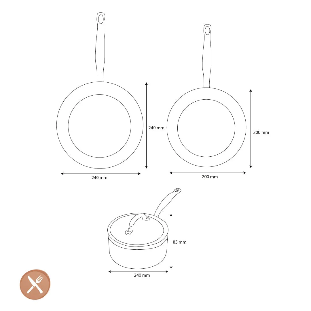 - Gewicht: Stevig maar comfortabel in gebruik (koekenpannen ca. 0,6 kg, hapjespan ca. 1,77 kg).