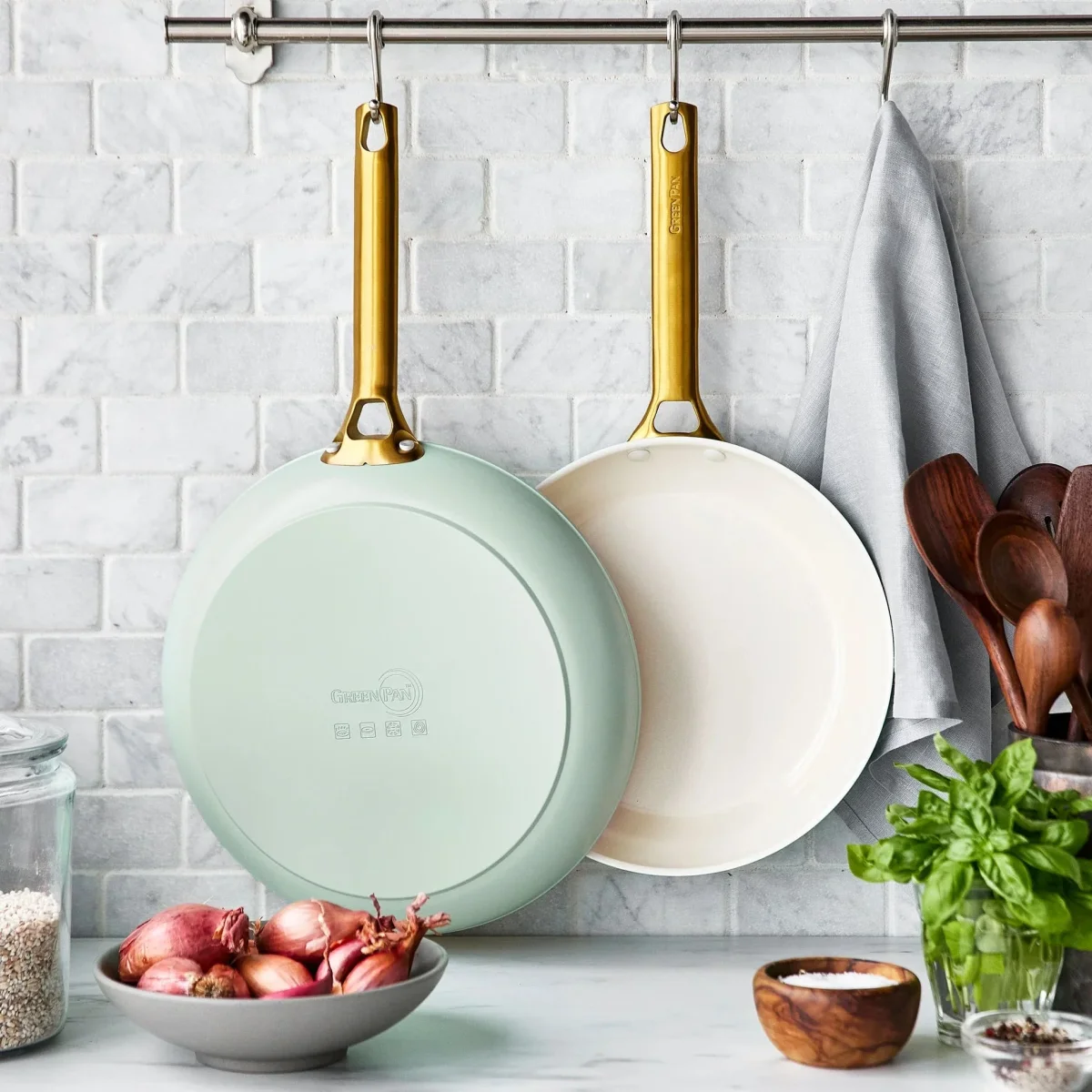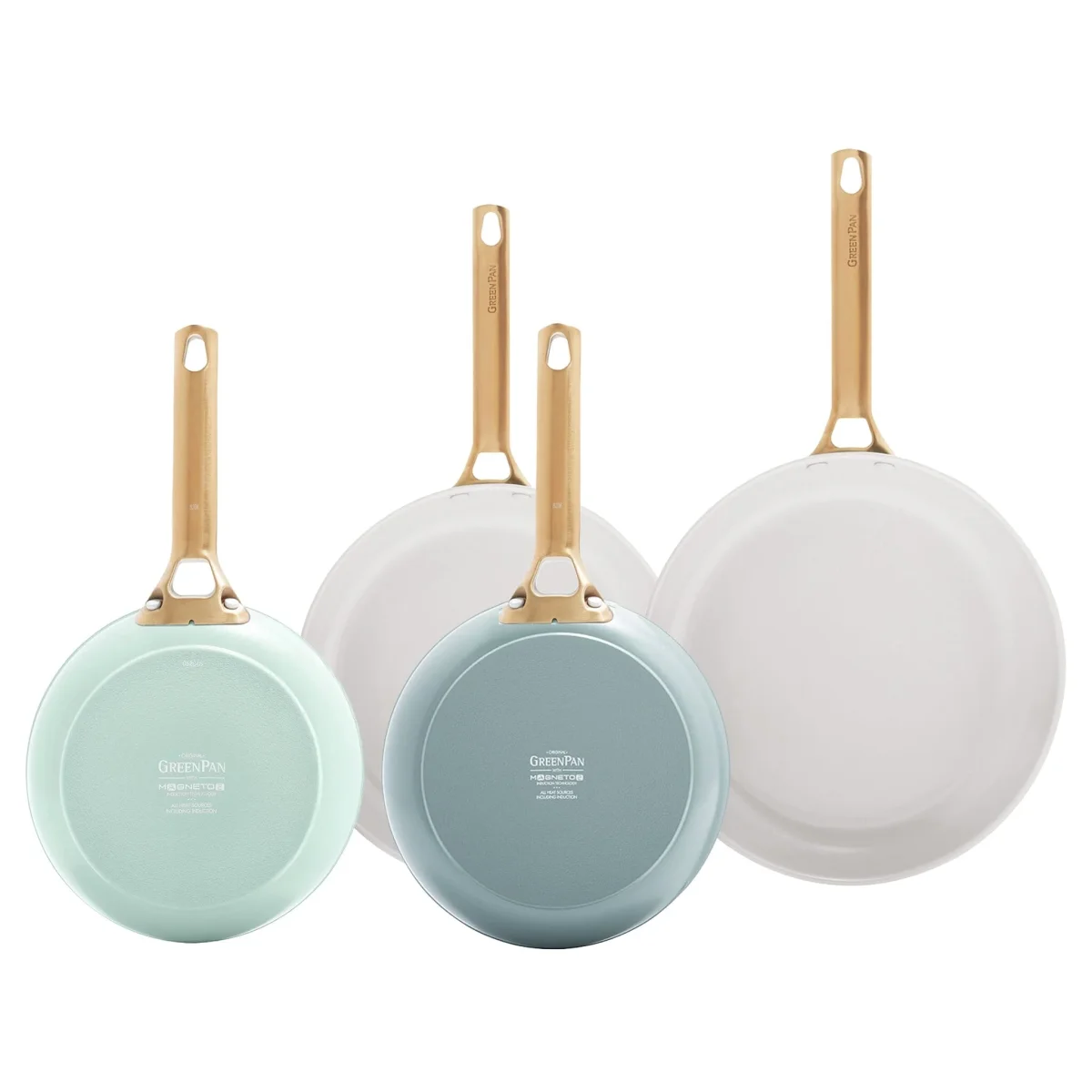 De Padova Smokey Blue & Mint Green 4-delige Koekenpannenset van GreenPan is de perfecte aanvulling op jouw keuken. Deze bundel combineert creatief koken met modern design: twee kleurvarianten met goudkleurige RVS handgrepen, ideaal voor alles van eieren en pannenkoeken tot roerbakken en braden.