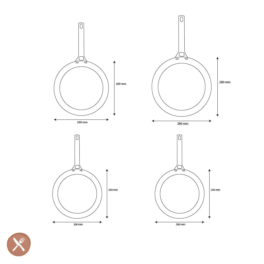 - Complete bundel (4 pannen): Smokey Blue 20 & 28 cm + Mint Green 20 & 26 cm, van kleine porties tot grotere gerechten.