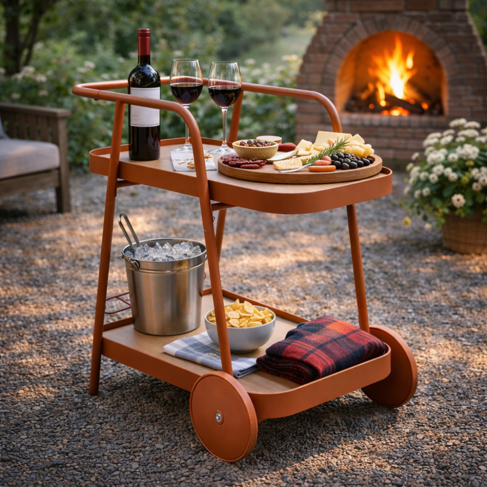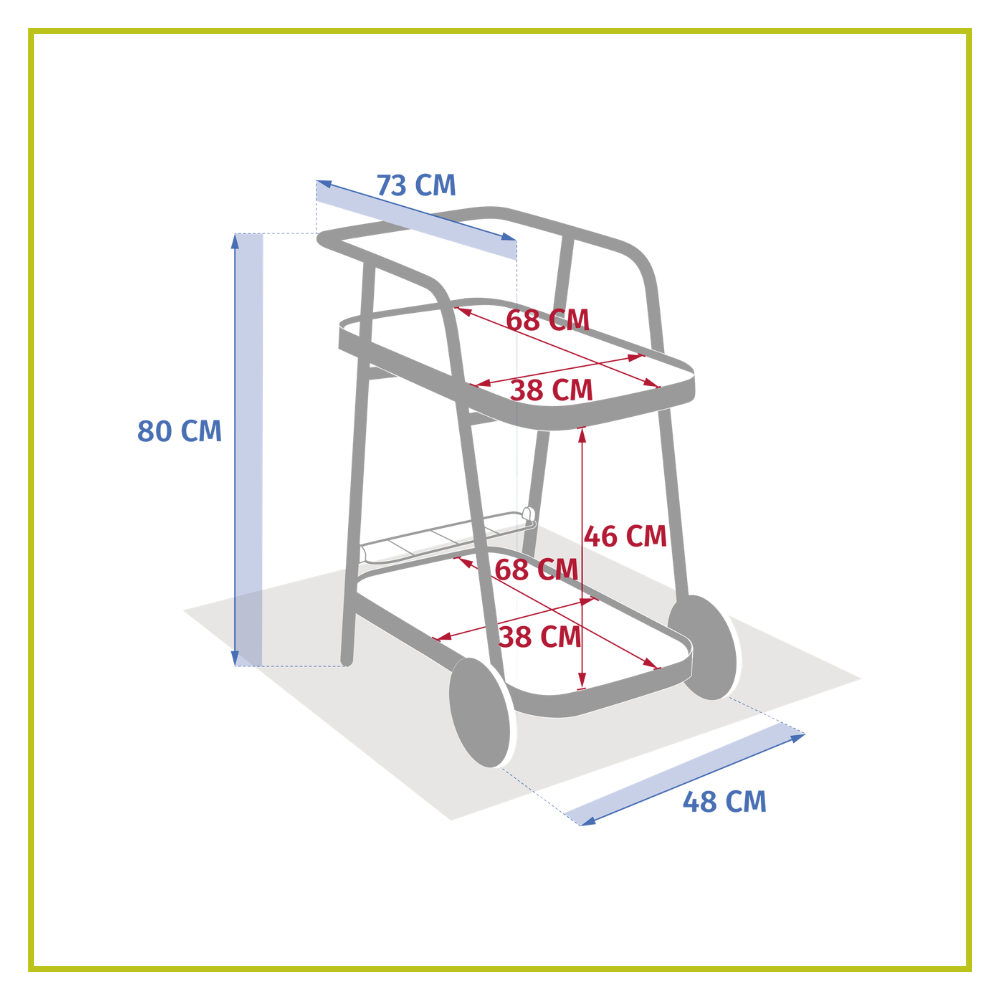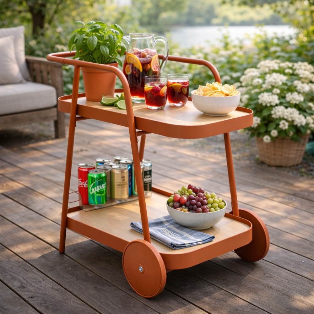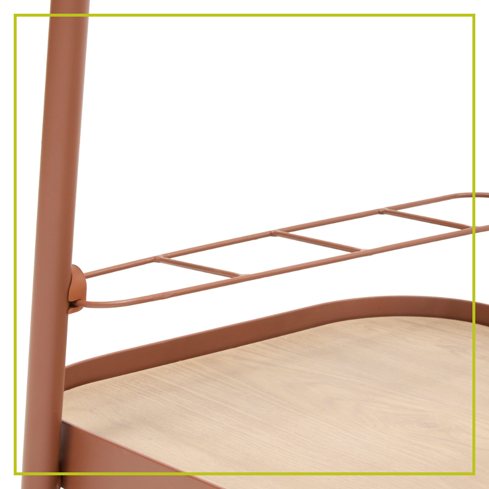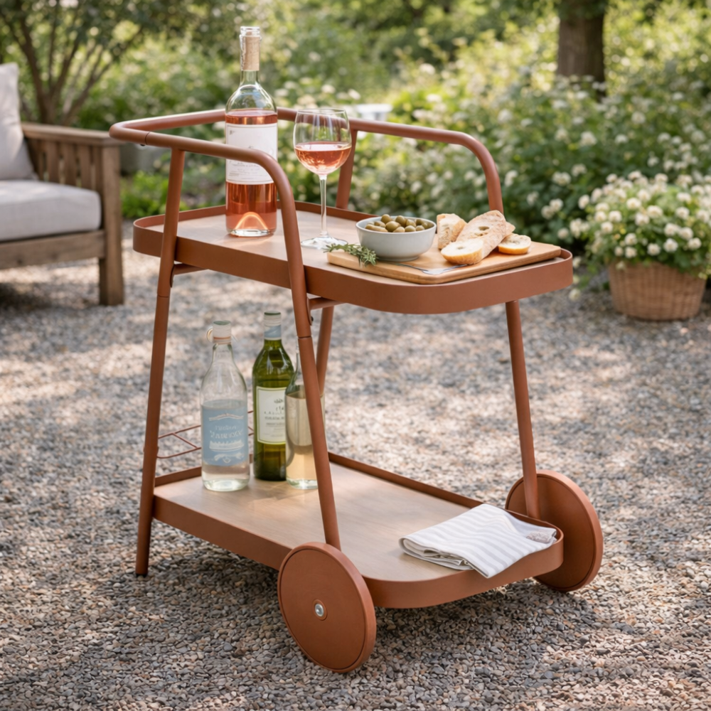 De serveerwagen beschikt over twee ruime plateaus, ideaal om drankjes, servies, hapjes of decoratie op te plaatsen. Dankzij de wielen verplaats je de trolley eenvoudig van de keuken naar de eettafel of naar buiten op het terras. De verhoogde rand van de plateaus zorgt ervoor dat glazen, flessen of accessoires stevig blijven staan tijdens het verplaatsen.