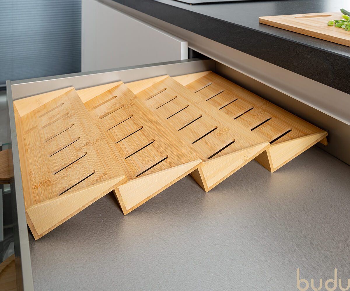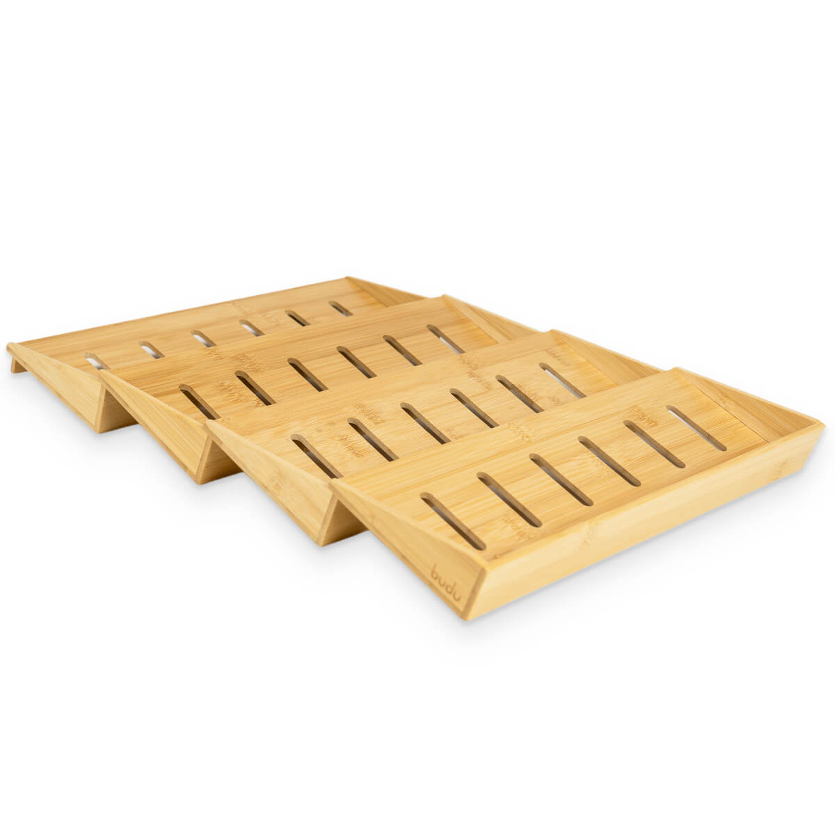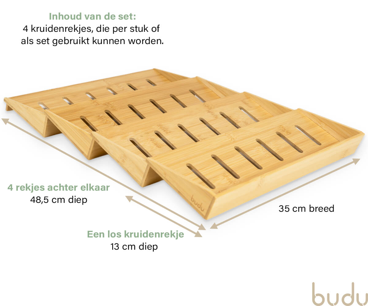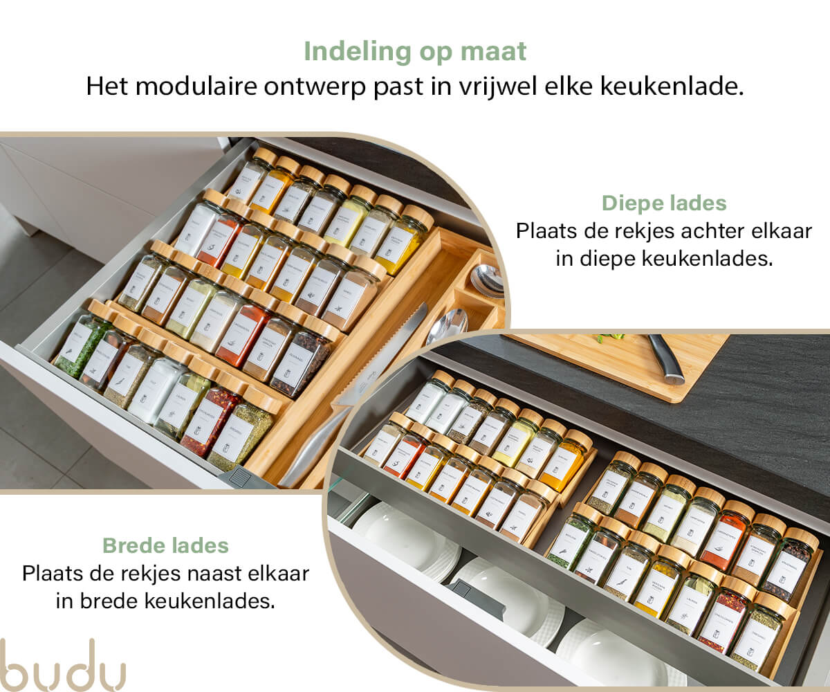 Organiseer je keukenlades met het Budu kruidenrek lade systeem van bamboe. Deze set van 4 losse kruidenrekjes is perfect voor het overzichtelijk opbergen van al je kruidenpotjes. De rekjes zijn modulair: plaats ze achter elkaar in diepe lades of naast elkaar in brede lades. Zo benut je de ruimte optimaal en heb je altijd het juiste kruid bij de hand. Gemaakt van duurzaam FSC® bamboe, met een luxe uitstraling en een slimme, ladevriendelijke pasvorm. Ideaal in combinatie met de Budu kruidenpotjes, maar ook geschikt voor andere standaard potjes.