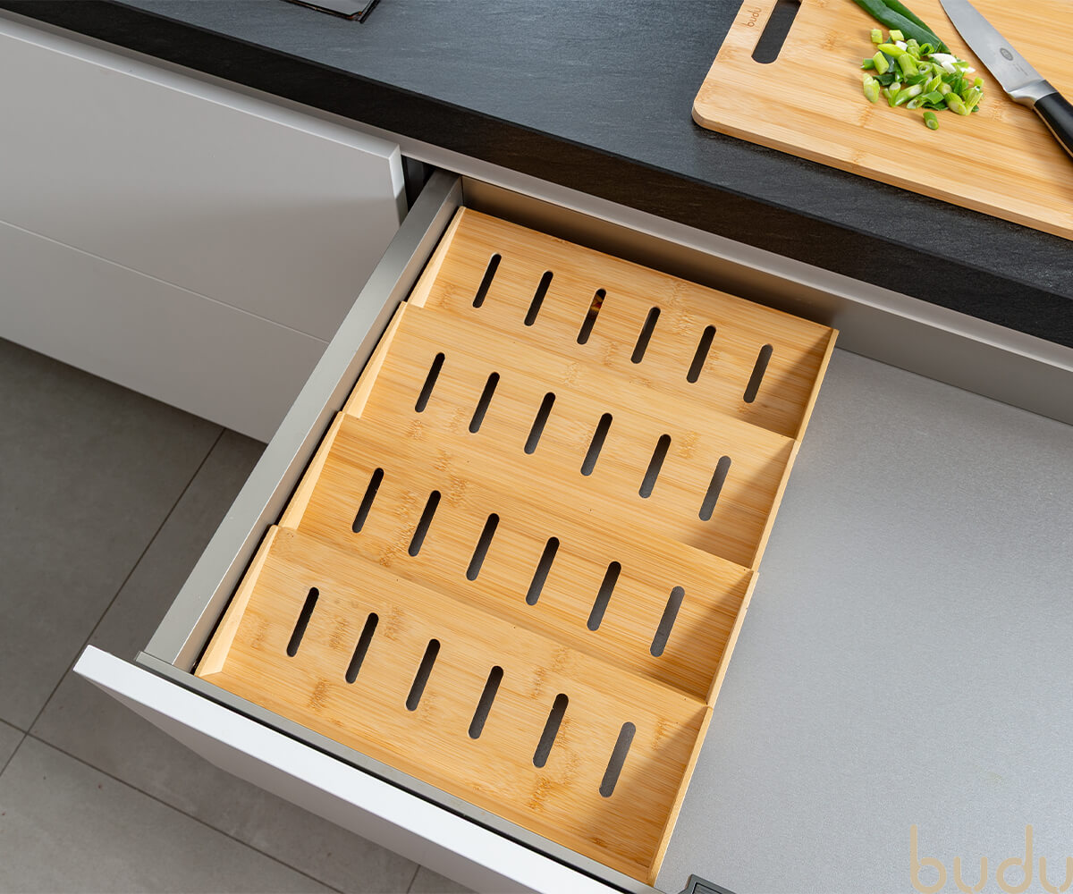 De rekjes zijn gemaakt van FSC® gecertificeerd bamboe, een van de meest duurzame grondstoffen ter wereld. Bamboe is slijtvast, antibacterieel en heeft een natuurlijke, warme uitstraling die perfect past in iedere keuken.