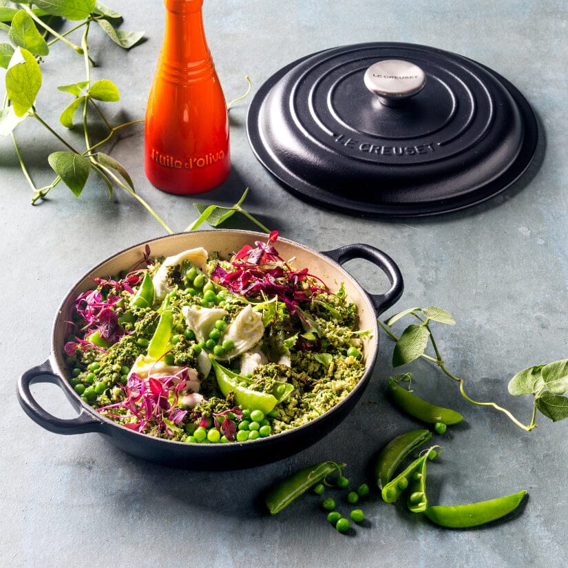 De Campagnard 26 cm in Mat Zwart van Le Creuset is een echte alleskunner in de keuken, ontworpen voor braden, bakken, stoven en karamelliseren. Deze platte, ronde braadpan van geëmailleerd gietijzer combineert kracht met elegantie, en is ideaal voor wie op zoek is naar maximale controle en smaak tijdens het koken. Dankzij de brede handgrepen, lage randen en nauwsluitende deksel is dit model perfect voor dagelijks gebruik én indrukwekkende diners.