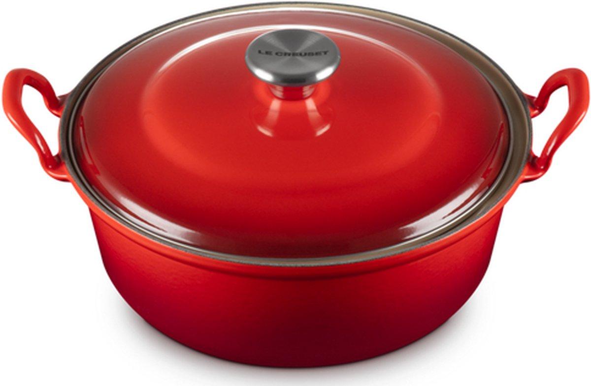 De faitout heeft een diameter van 28 cm en is uitgevoerd in een fraaie rode kleur.