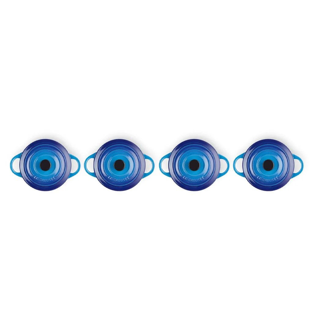 Breng kleur en charme op tafel met deze set van vier mini-braadpannen van Le Creuset. Vervaardigd uit hoogwaardig aardewerk en afgewerkt in het iconische Azure, zijn deze kleine pannen perfect voor het serveren van hapjes, desserts, voorgerechten of snacks. Dankzij hun compacte formaat zijn ze niet alleen functioneel, maar ook onweerstaanbaar schattig.