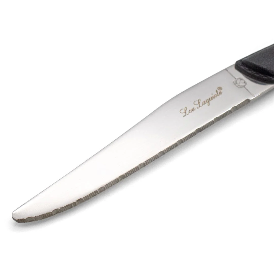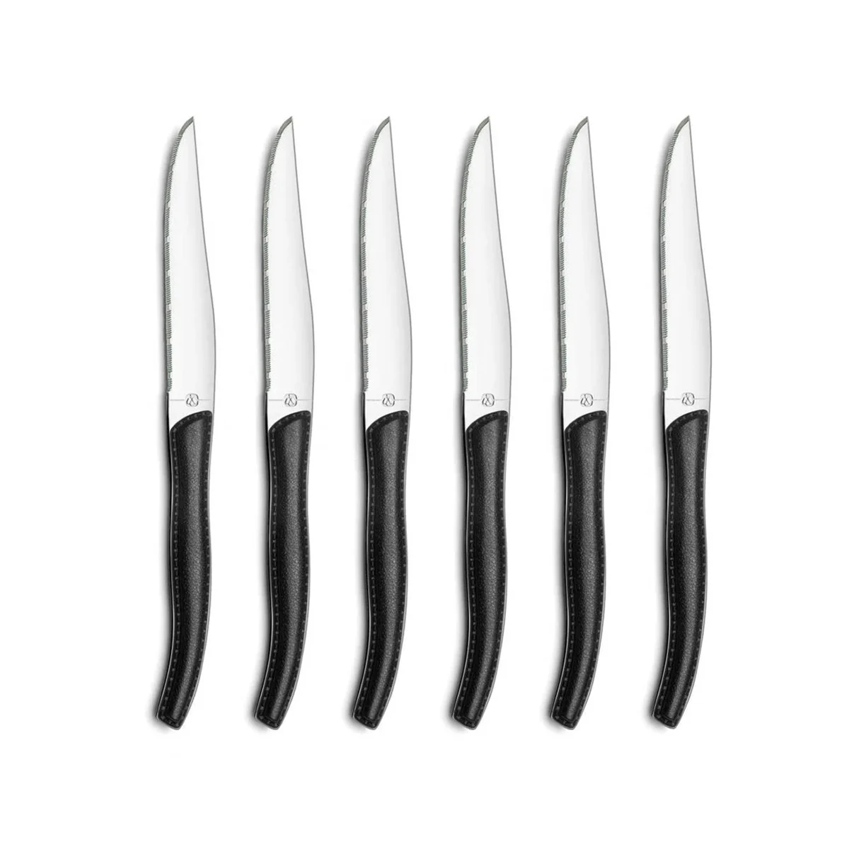 Deze steakmessen met stijlvolle zwarte lederlook afwerking aan de handvatten brengen een perfecte combinatie van klassiek en modern op tafel. De traditionele vorm geeft een unieke uitstraling en de precies aangebrachte kartels maken het snijden door alle gerechten moeiteloos. Dankzij de karakteristieke Franse Laguiole vormgeving van deze messen, met oog voor elk detail, creëer je sfeer aan tafel en kun je in stijl genieten van een heerlijke maaltijd.