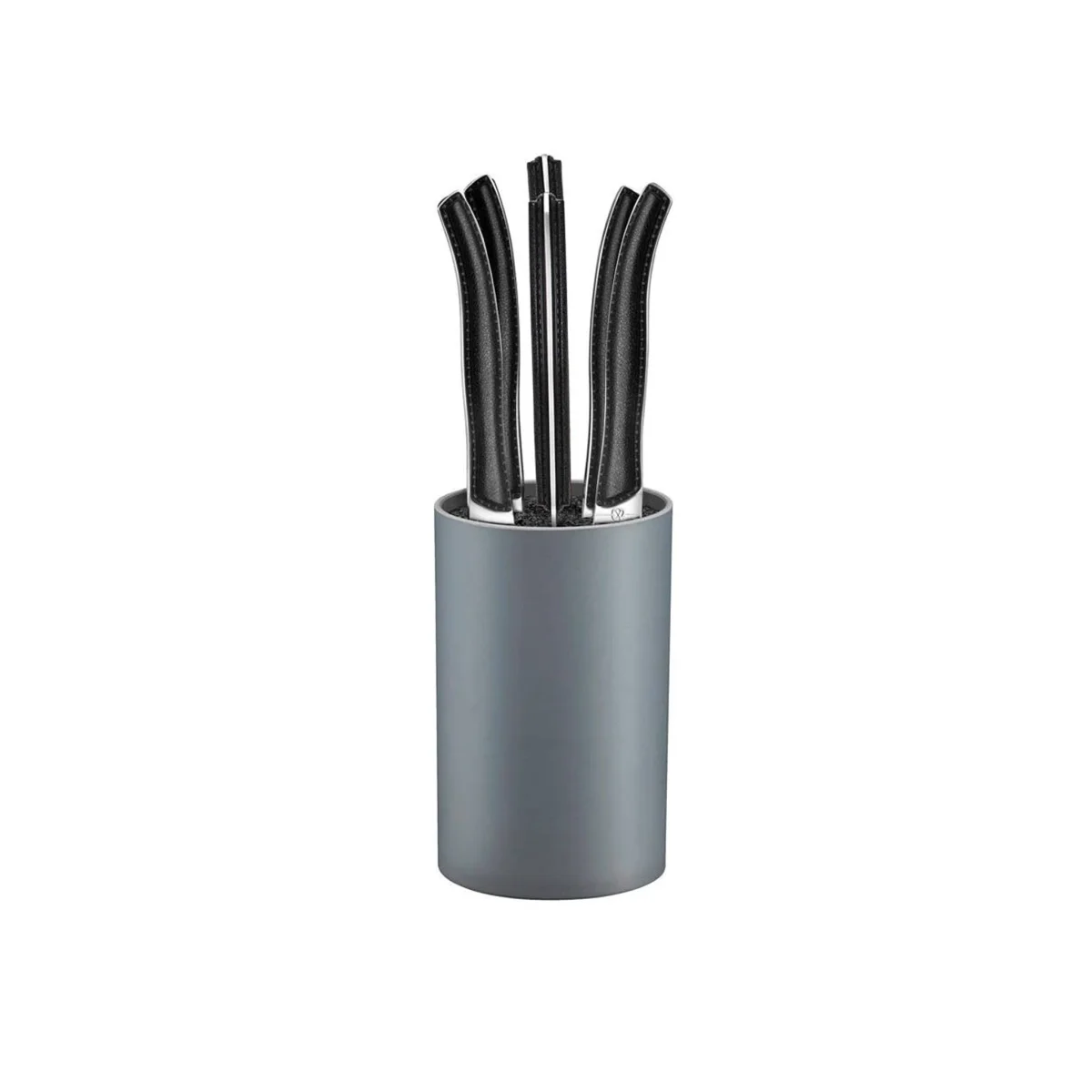 De messen worden geleverd met een stijlvol, grijsgekleurd messenblok. Dit universele messenblok heeft een flexibele binnenkant van plastic stengels. Hierdoor hoef je de messen niet los in de keukenla te leggen, wat het risico op beschadiging vermindert.