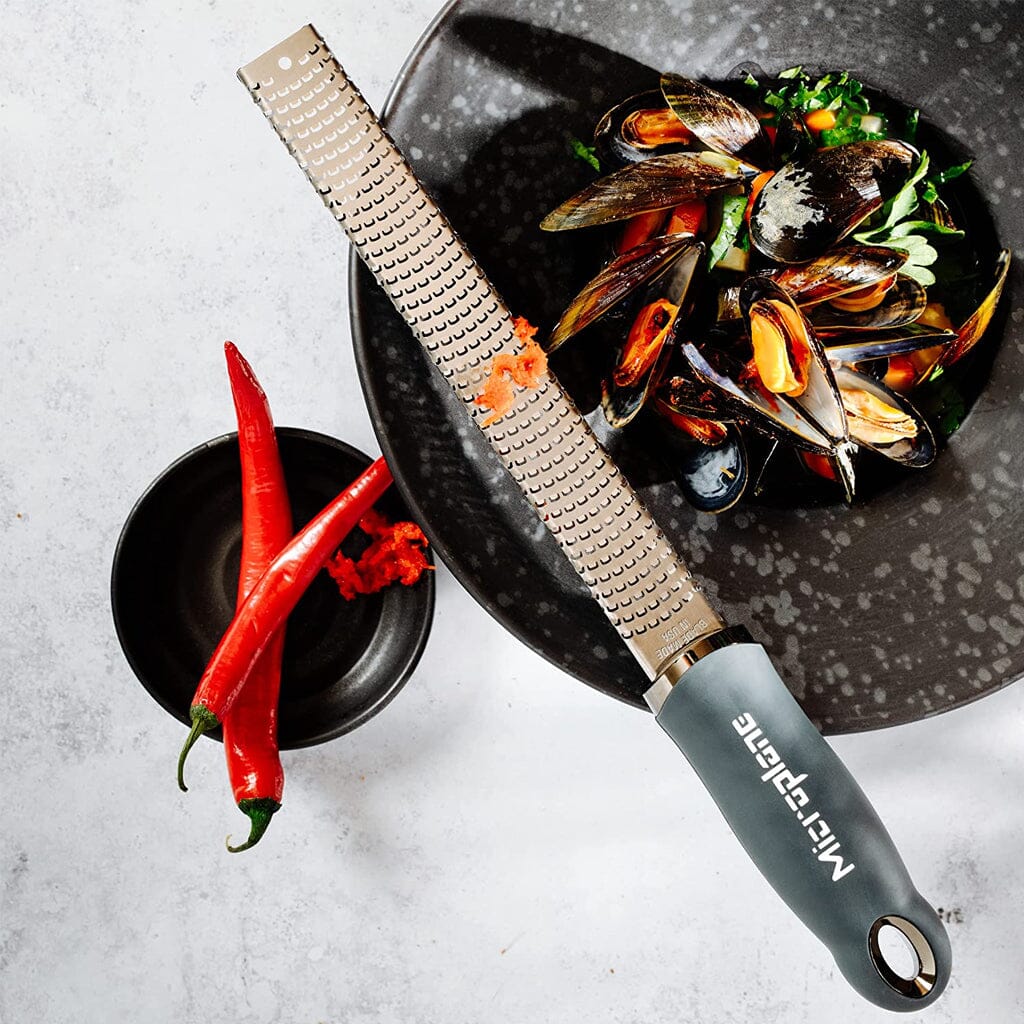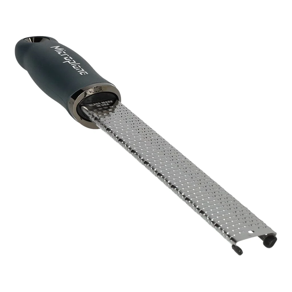 Maak kennis met de ultieme keukenhulp – de Premium Classic Rasp Zesteur After Dark Grijs van Microplane. Deze rasp is perfect voor het fijn raspen van kaas over je favoriete pasta gerecht of voor het raspen van citrus schillen. De Premium Classic-serie van Microplane heeft een soft touch handvat en rubberen voetjes aan de onderkan van de rasp. De raspen van de Premium Classic serie worden wereldwijd door chefs gebruikt en zijn zelfs te zien op Televisie!
