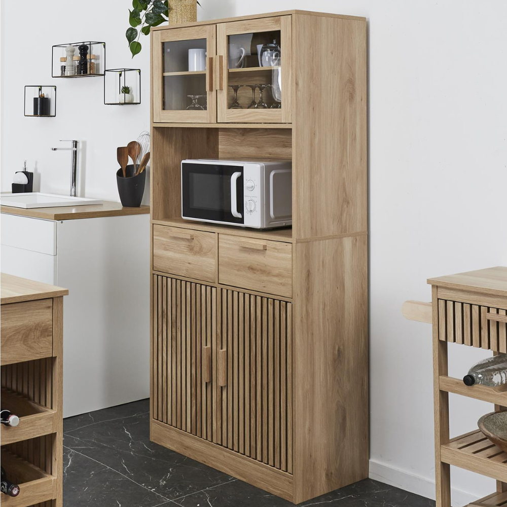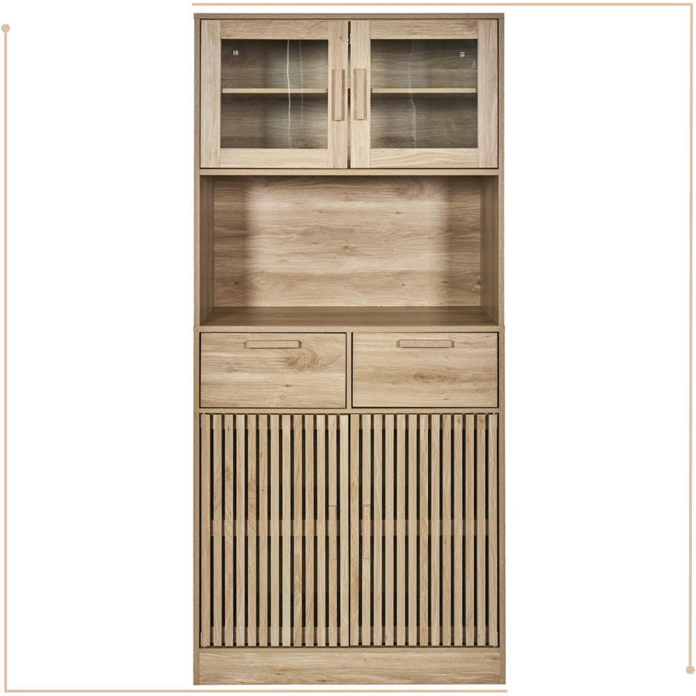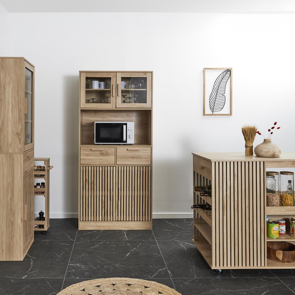 Voeg slimme opbergruimte toe aan je keuken met de MISOU Magnetronkast. Deze multifunctionele wandkast in warme houtlook biedt een ideale combinatie van open vakken, dichte lades en een ruim blad voor het plaatsen van een magnetron of keukenapparaat. Perfect als buffetkast, servieskast of extra opbergruimte in de keuken of eetkamer.