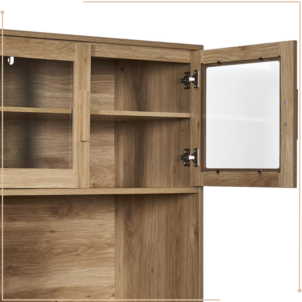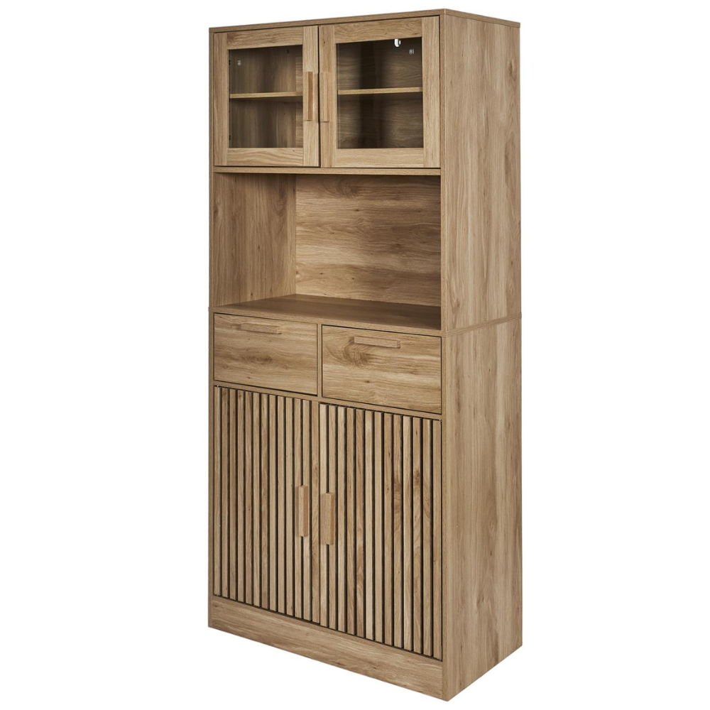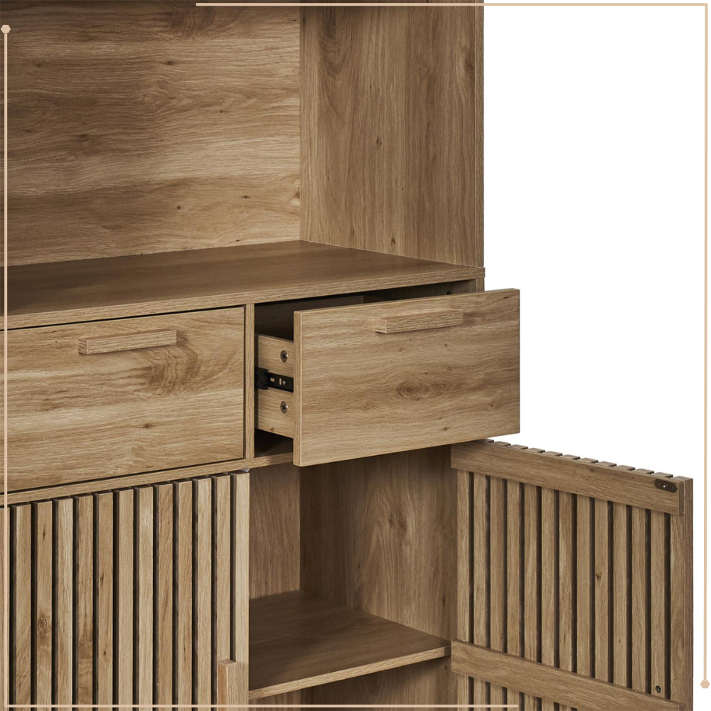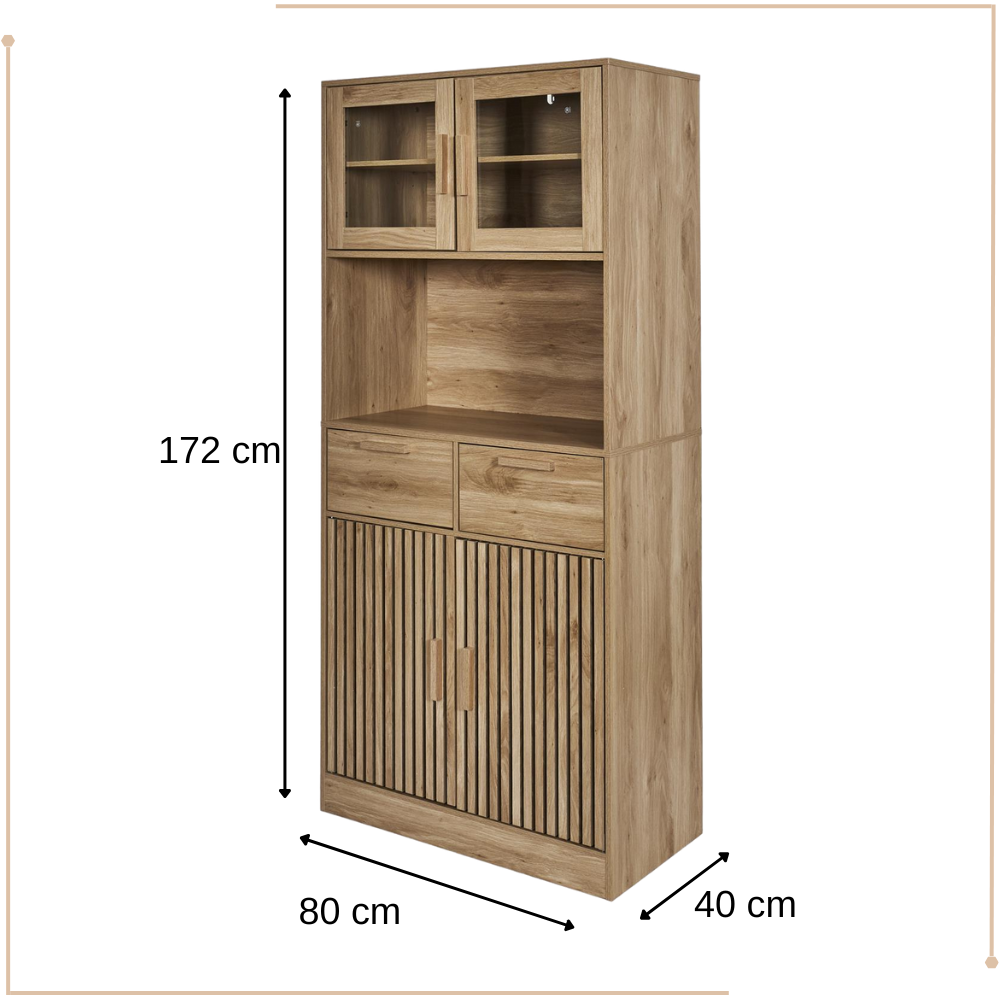 Voeg slimme opbergruimte toe aan je keuken met de MISOU Magnetronkast. Deze multifunctionele wandkast in warme houtlook biedt een ideale combinatie van open vakken, dichte lades en een ruim blad voor het plaatsen van een magnetron of keukenapparaat. Perfect als buffetkast, servieskast of extra opbergruimte in de keuken of eetkamer.