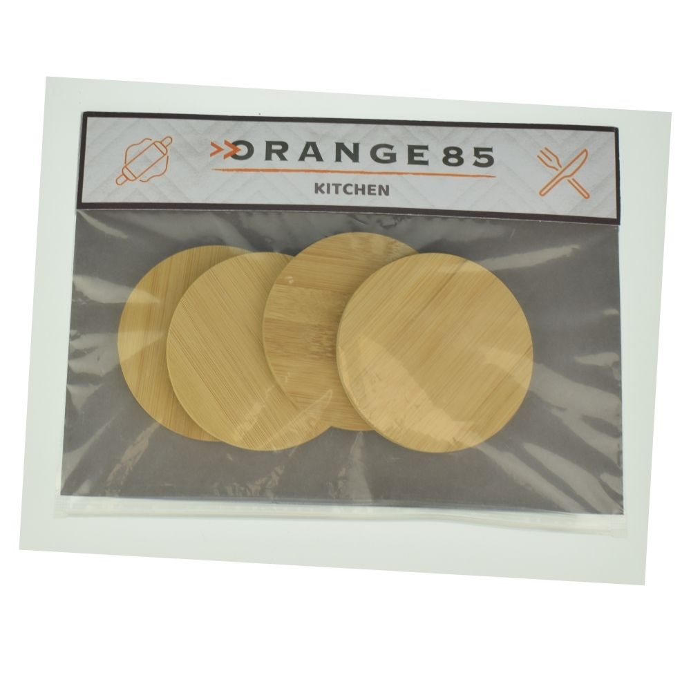 Vier onderzetters van Orange85 gemaakt van bamboe. Bamboe is een milieuvriendelijk materiaalsoort en gaat lang mee. De onderzetters voorkomen vlekken op het oppervlak.
