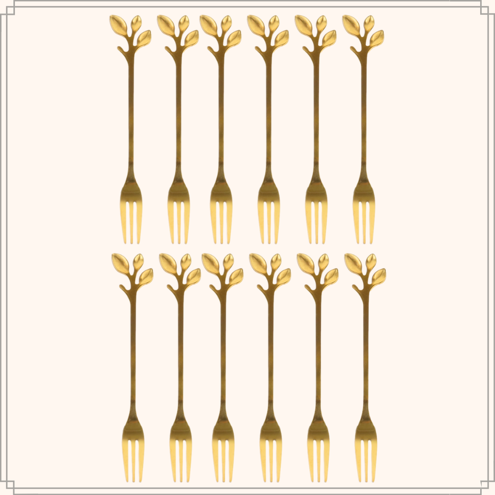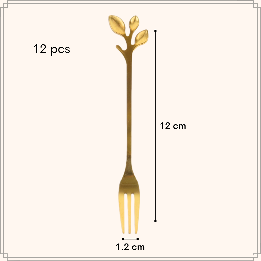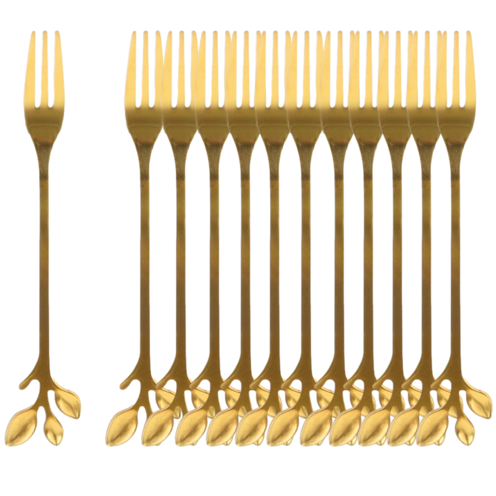Maak je dessertpresentatie compleet met de OTIX Gebaksvorkjes. Deze set van 12 goudkleurige vorkjes met prachtige bladeren accenten voegt een vleugje elegantie en luxe toe aan je tafel. Elk vorkje is zorgvuldig vervaardigd en heeft een stijlvol ontwerp, waardoor ze perfect zijn voor het serveren van gebak, taart, desserts en meer.