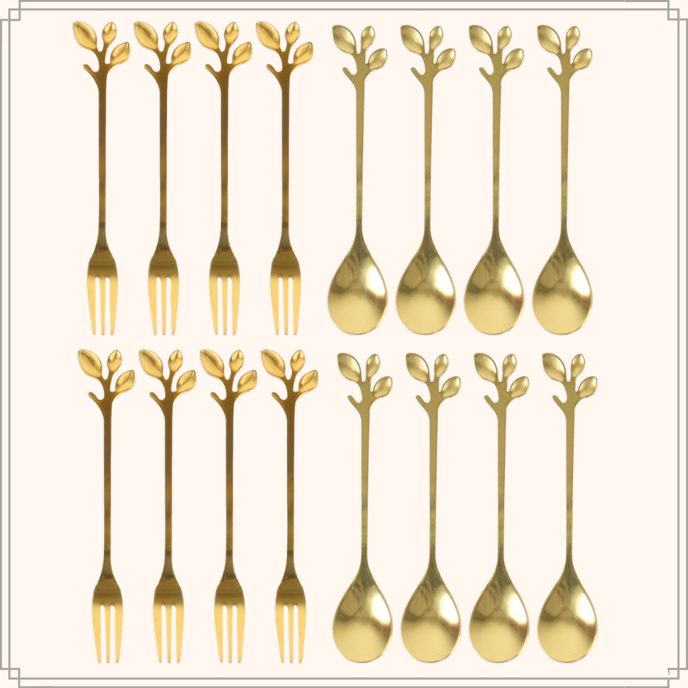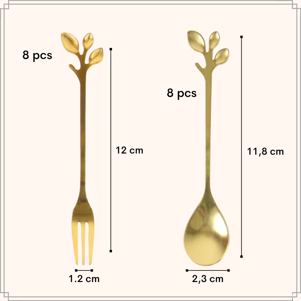 Maak je dessertpresentatie compleet met de OTIX Gebaksvorkjes. Deze set van 8 goudkleurige vorkjes en 8 lepeltjes met prachtige bladeren accenten voegen een vleugje elegantie en luxe toe aan je tafel. Elk vorkje en lepeltje is zorgvuldig vervaardigd en heeft een stijlvol ontwerp, waardoor ze perfect zijn voor het serveren van gebak, taart, desserts en meer.