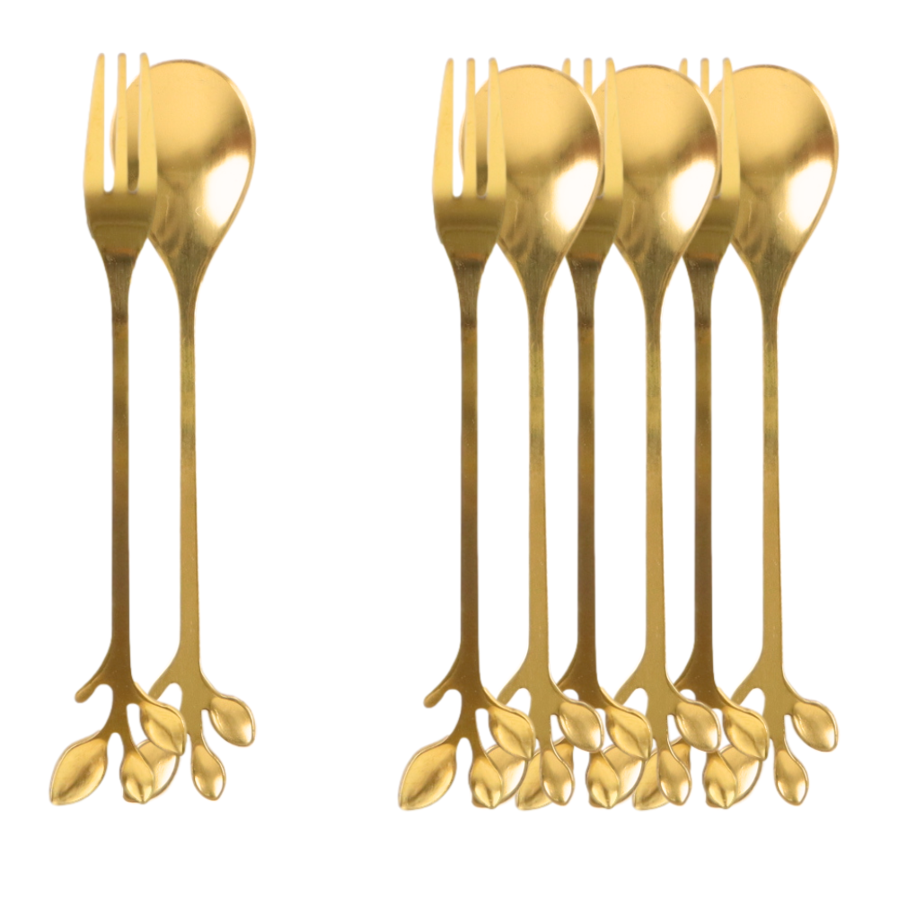 Maak je dessertpresentatie compleet met de OTIX Gebaksvorkjes. Deze set van 4 goudkleurige vorkjes en 4 lepeltjes met prachtige bladeren accenten voegen een vleugje elegantie en luxe toe aan je tafel. Elk vorkje en lepeltje is zorgvuldig vervaardigd en heeft een stijlvol ontwerp, waardoor ze perfect zijn voor het serveren van gebak, taart, desserts en meer.